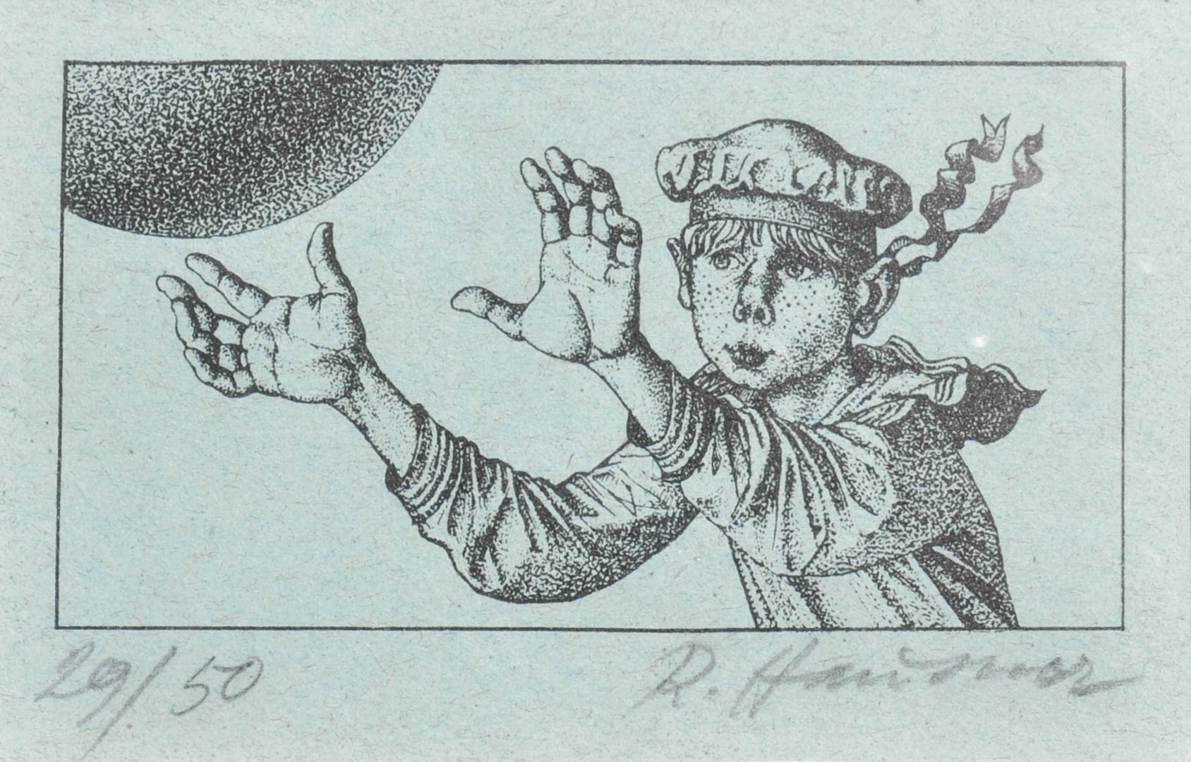 Rudolf Hausner (Wien/Vienna 1914 – Mödling 1995) Ragazzo che gioca a palla;Litografia, incisione, 7 x 11 cm (entro il passepartout), in cornice