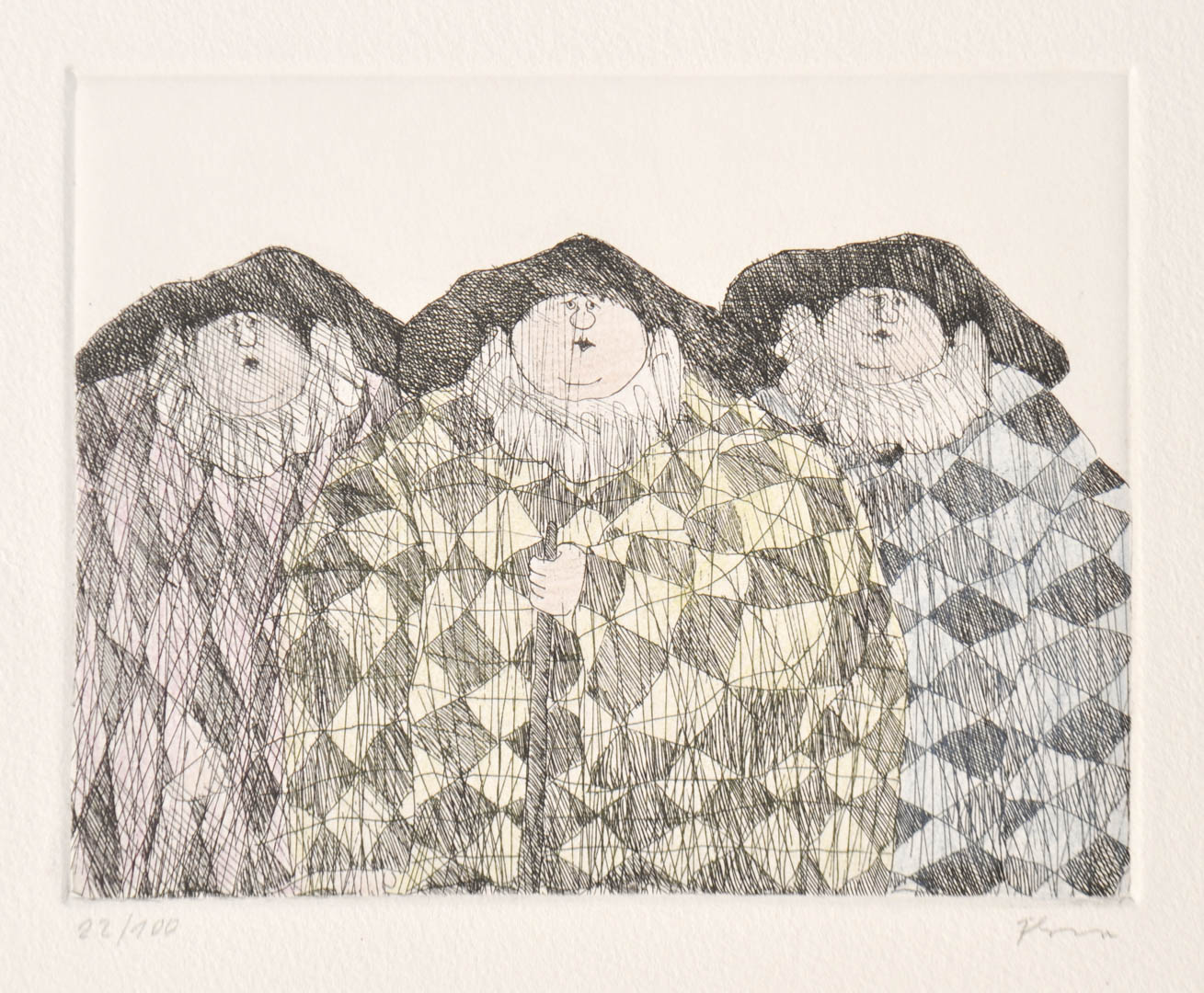 Paul Flora (Glurns/Glorenza 1922 – Innsbruck 2003) Tre pagliacci;Acquaforte colorata a mano, 11,5 x 14,5 cm (lastra),