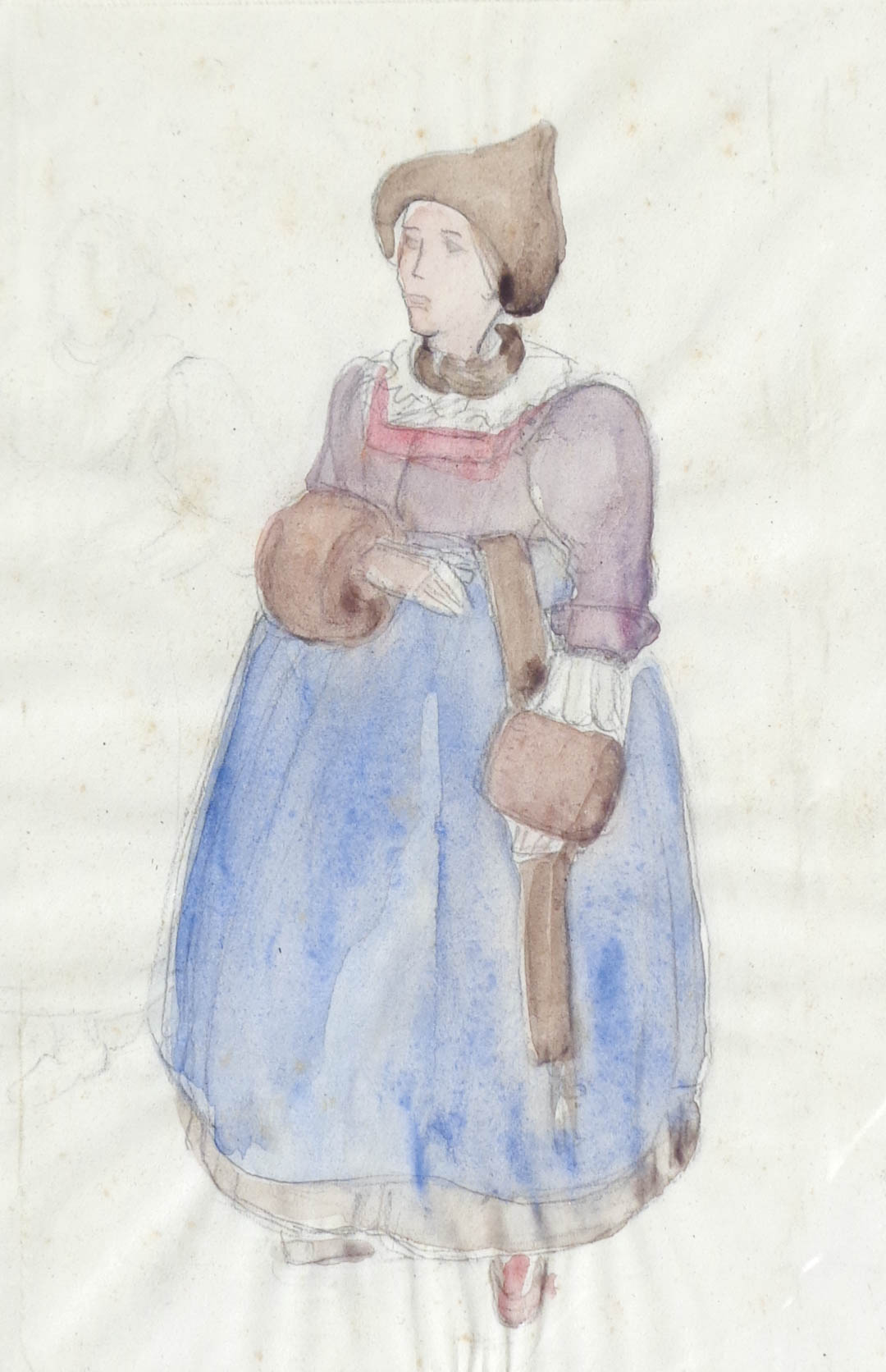 Maria Delago (St. Leonhard/S. Leonardo 1902 – Brixen/Bressanone 1979) Costume tradizionale della Valle Isarco;Matita, acquerello, 15 x 9,8 cm, piccole macchie, in cornice
