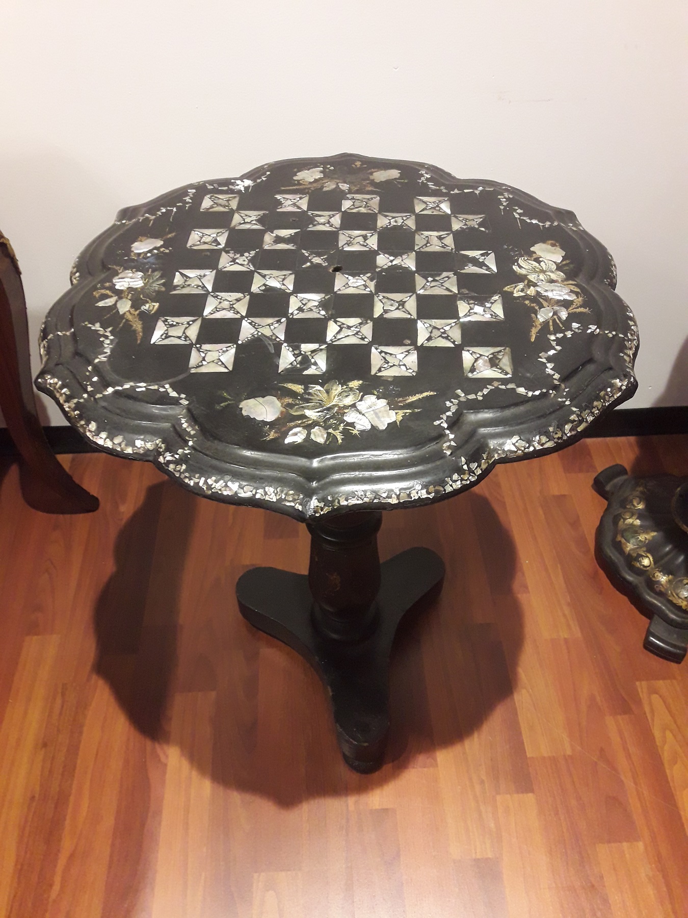 Ebonized wood with mother of pearl checkerboard inlays, folding top, measures 55x57x70 cm H.