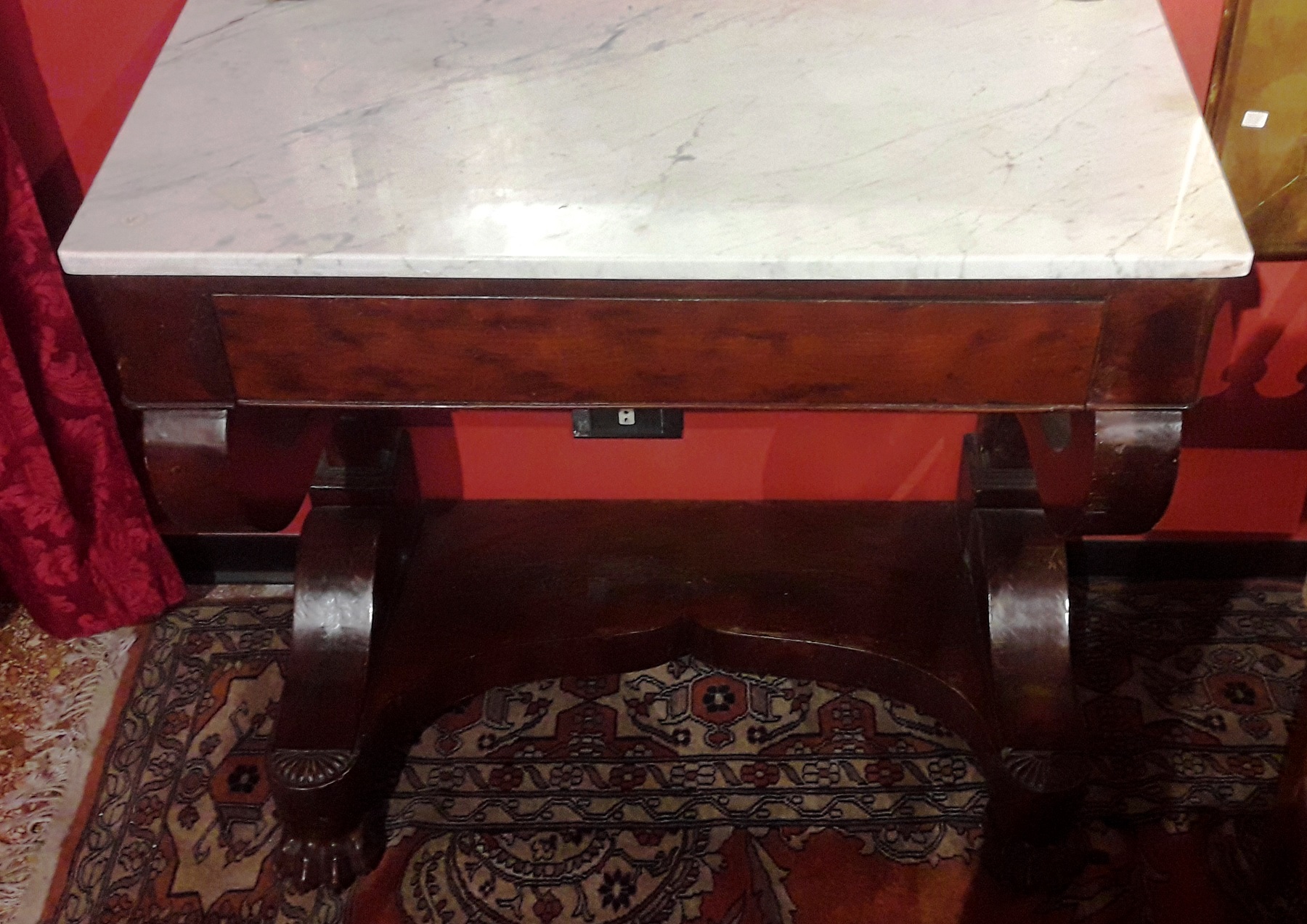 made of mahogany feather, with Carrara coevo marble. Italian style. Size 41.5x80x77 H.