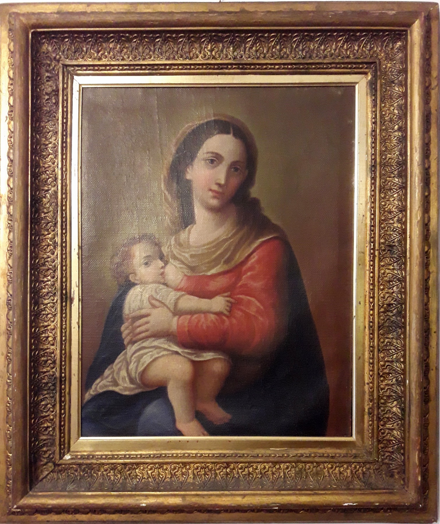iconography representing Madonna with child. It operates with a carved glove frame, to be restored. Canvas size cm 55x70, frame cm 86x100.