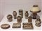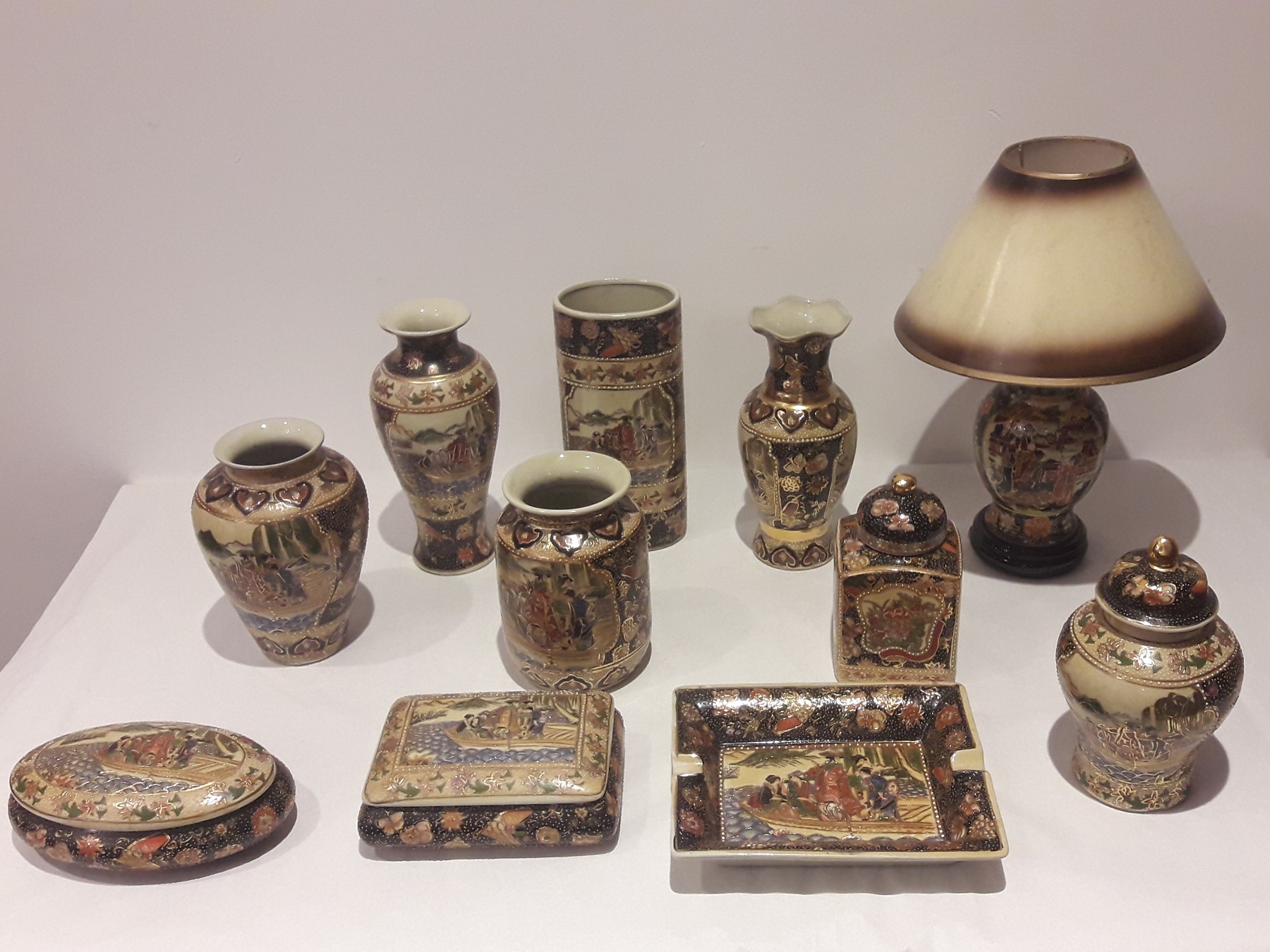 SERVIZIO realizzato in fine porcellana cinese con decori a rilievo. Il servizio e’ composto da: 5 portafiori cm 21 h; 1 lume, 2 portagioie cm 16x12, 1 posacenere cm 16x19, 2 anfore rispettivamente cm 15x8 e cm 18x11.