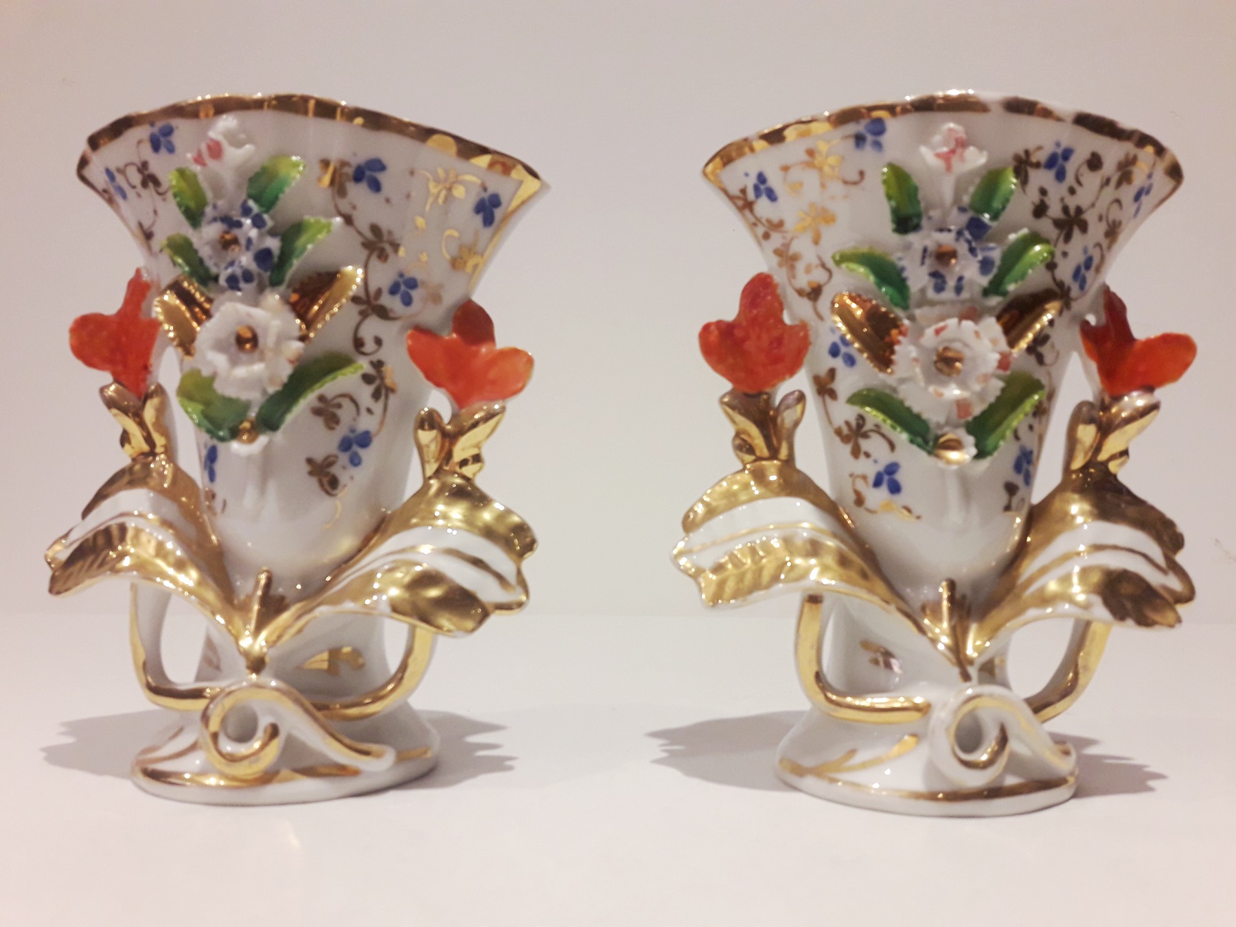 COPPIA DI PORTAFIORI stile vecchia Parigi, realizzati in porcellana francese. I pezzi sono numerati e misurano cm 14x17 H.