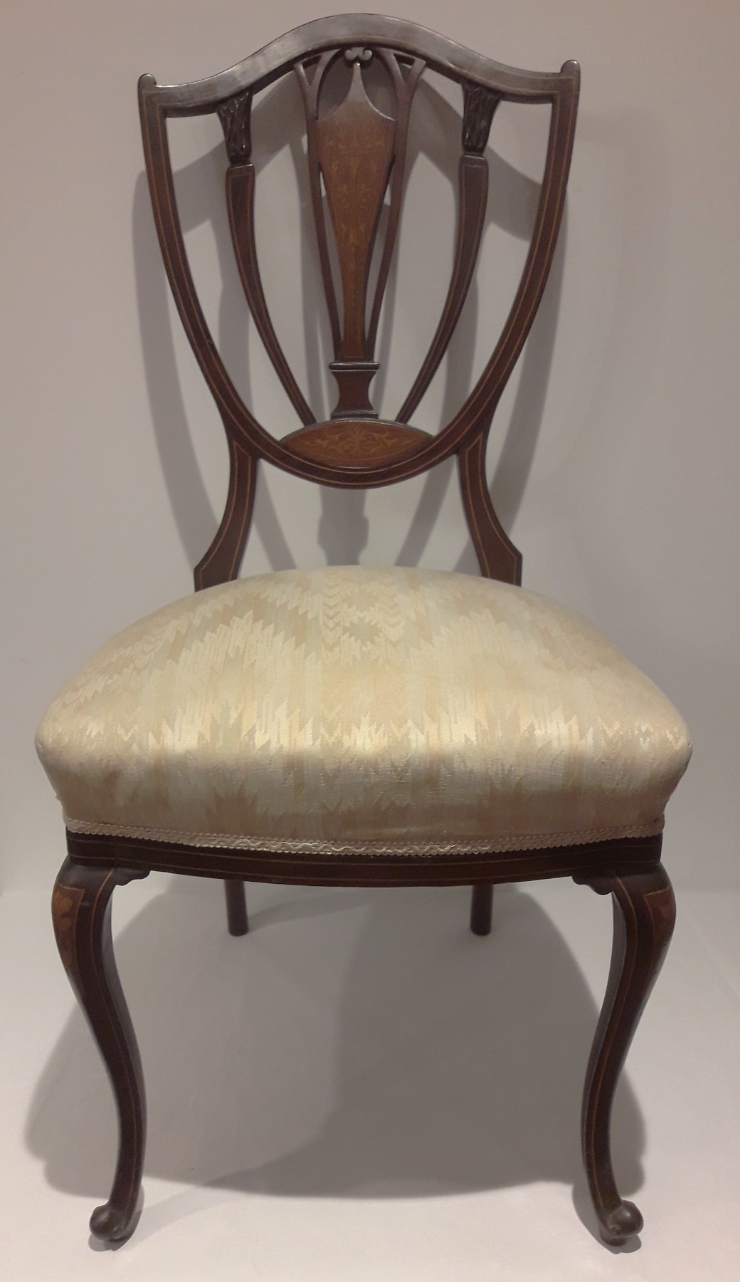SET 4 SEDIE in stile inglese realizzate in mogano e finemente intarsiate. Alla spalliera misura cm 96, la seduta cm 45x47.