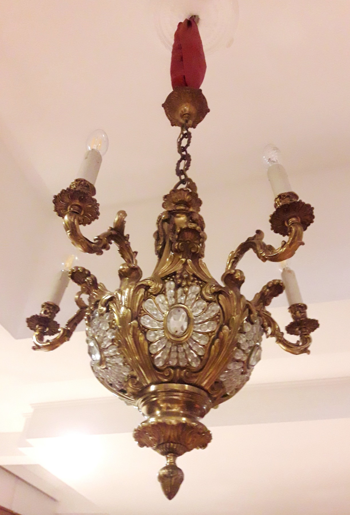 LAMPADARIO realizzato in fusione di bronzo dorato con elementi in cristallo a 6 luci. Dimensioni cm 50x90 H.