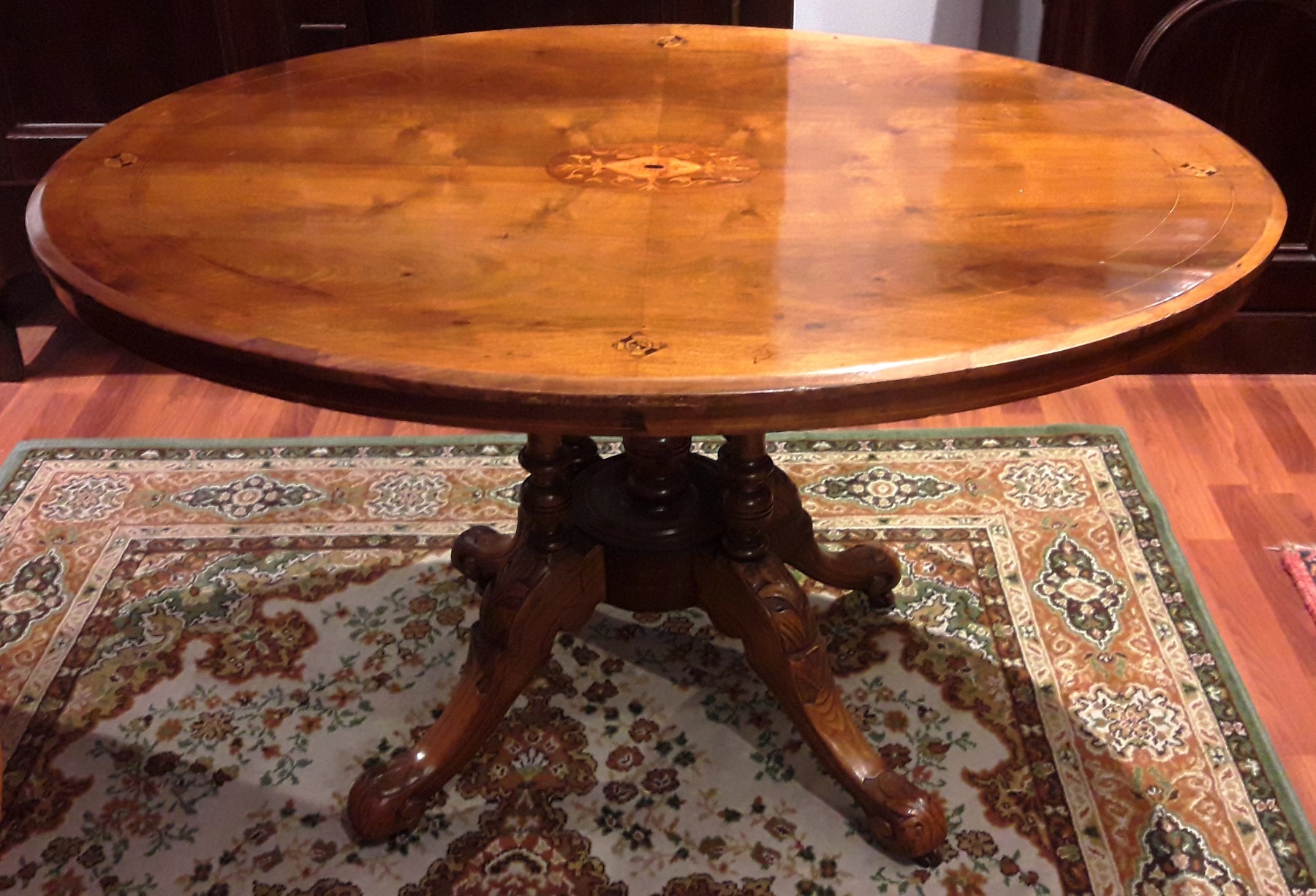 TAVOLO di forma ovale realizzato in radica di noce, stile inglese, intarsiato con 5 fregi sul piano. Dimensioni cm 117x84x73 H.