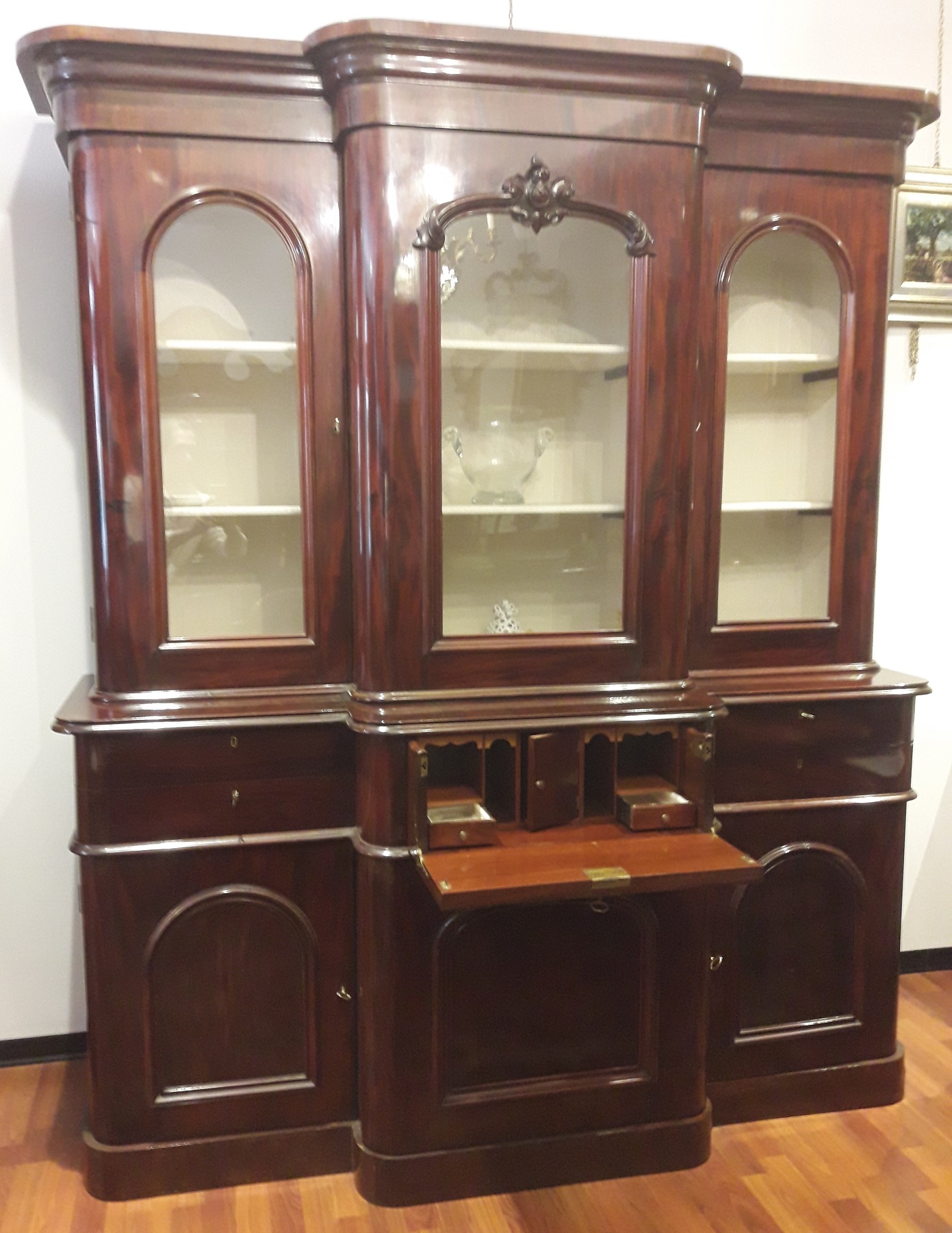book-house, English style, made of mahogany feather, 3 glass doors with two shelves inside and 3 blind doors. On the front it has 5 drawers, one of which is tilted containing 4 niches, 1 antina and two drawers. Size cm 195x72x233 H.