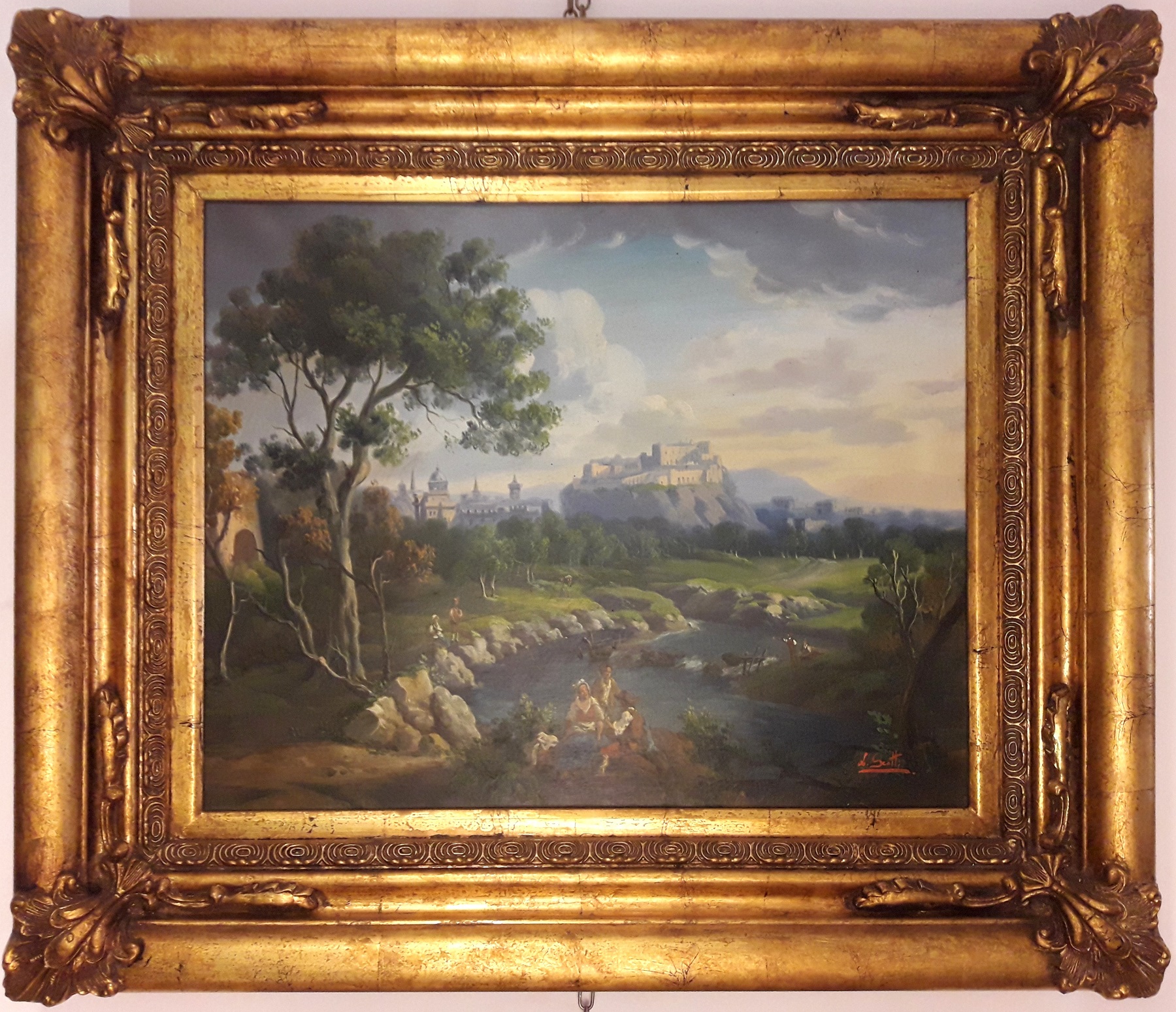 OLIO SU TELA dell’ autore A. Scotti, raffigurante paesaggio napoletano.. Dimensioni cornice cm 60x70, dipinto cm 50x40.