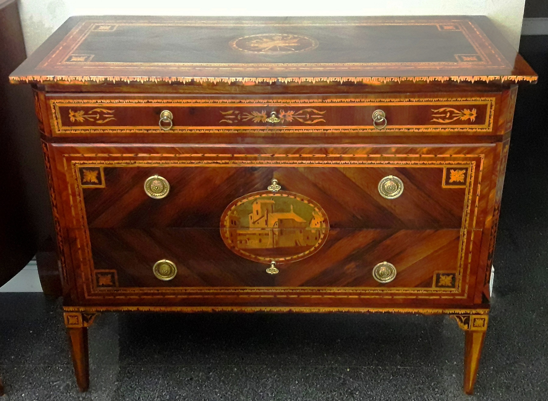 in the manner of G. Maggiolini. Walnut slab and intatures in various fine woods, with 2 drawers plus 1 drawer. On the sides present intarsi to rosette and squares. Years 1760/90 cm Size 51x115,5x93.5 H. .