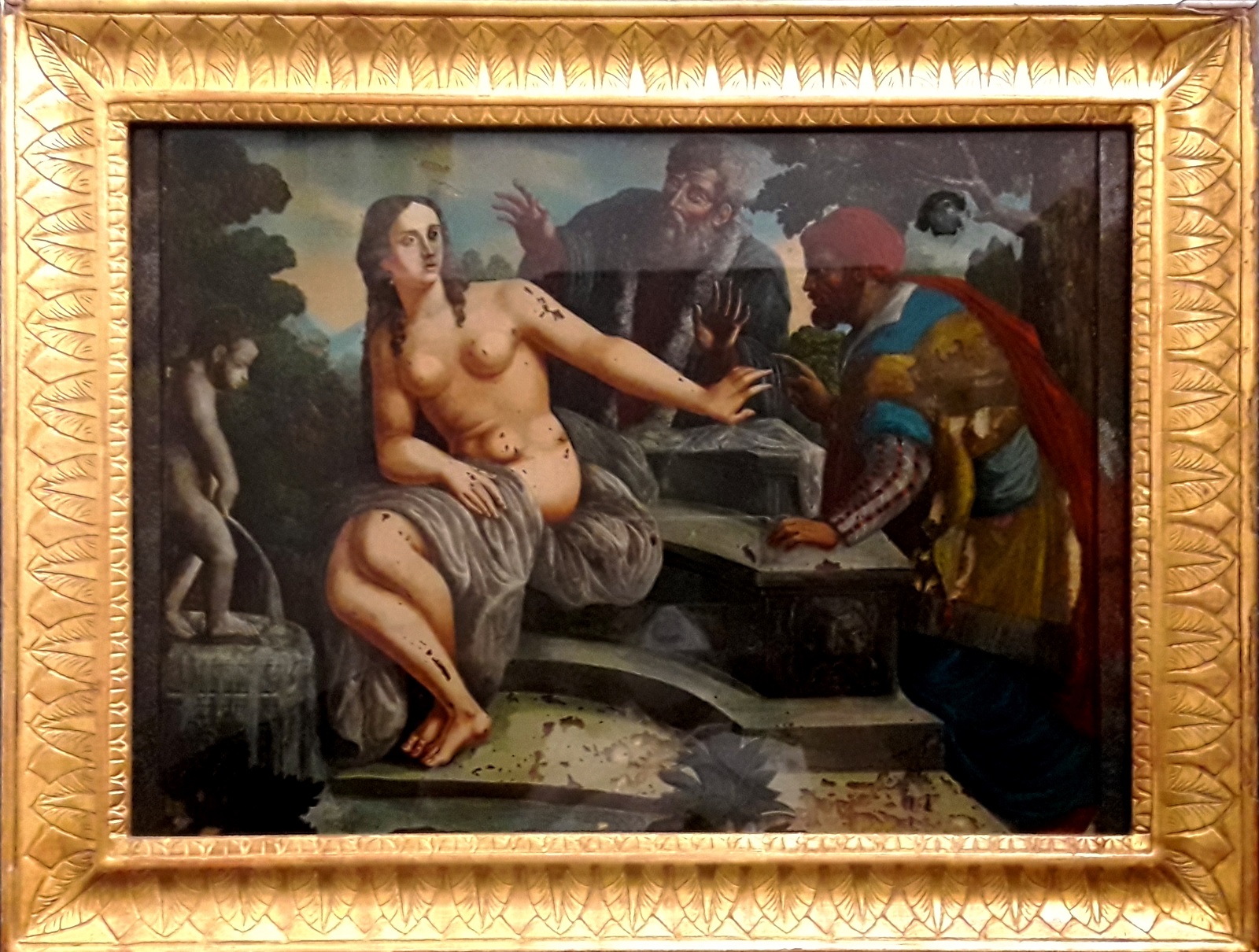 made on glass, Italian school, it represents Susanna and the Vecchioni. Dating back to the 1600s. Work with frame from the neoclassical period. Dimensions 44.5x32 cm, frame 55.5x42.5.