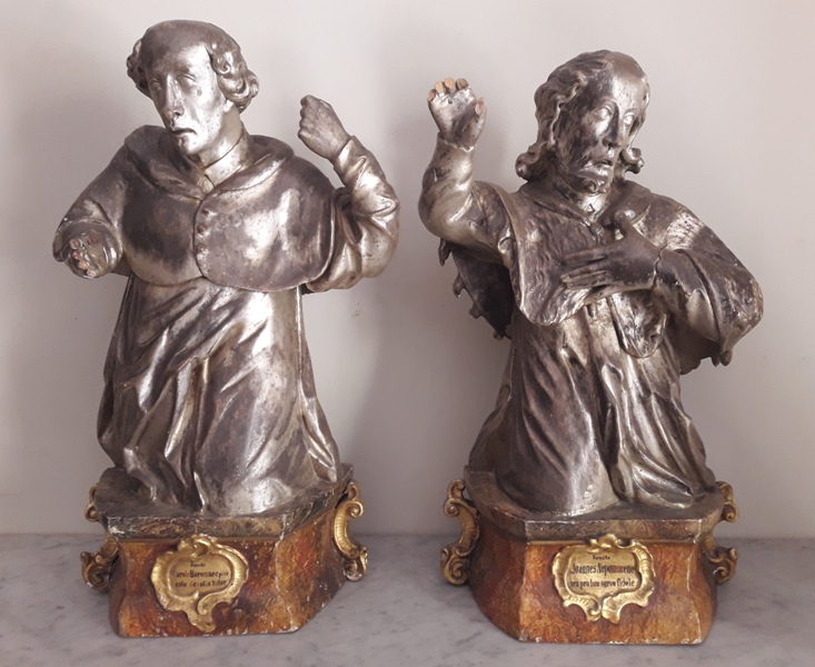 made of wood, silver me meccas and equipped with lacqated and marbled base. They represent St. Carlo Borromeo and St. John Nepocemene respectively, with some shortcomings on both. Period late 600 early 700. Size cm 37x16x60 H.