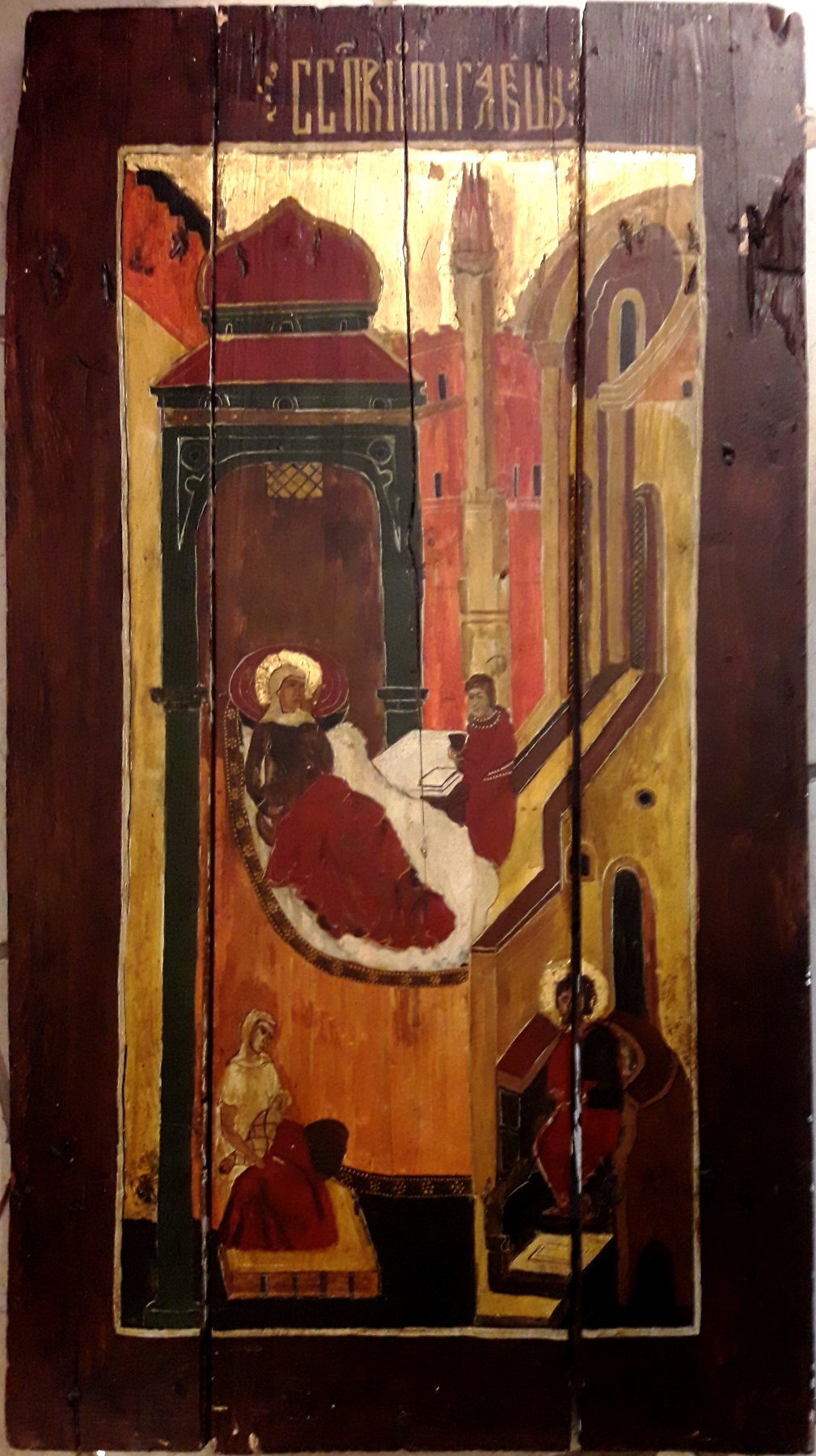 ICONA DELLA TRANSILVANIA Nascita Madonna”. Provenienza Romania, periodo 1920/50. Dimensioni cm 50x90 H.