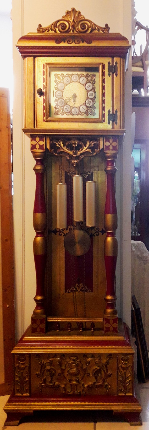 PENDOLA origine di fattura veneziana anni 50. Rintocco ogni ora e mezz’ora, con meccanismo da registrare. Dimensioni cm 62x36x192 H.