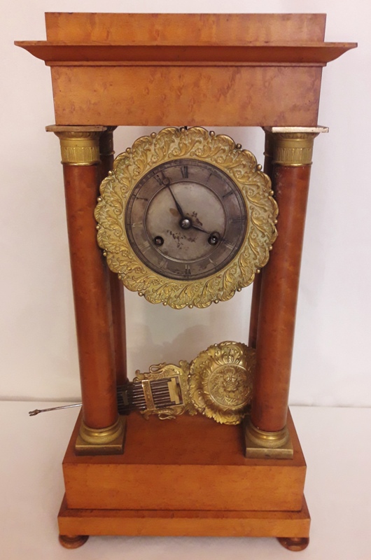 OROLOGIO in stile impero di provenienza francese , a colonne piene. Realizzato in radica di noce, da riparare. Dimensioni cm 28,5x16x49,5 H.
