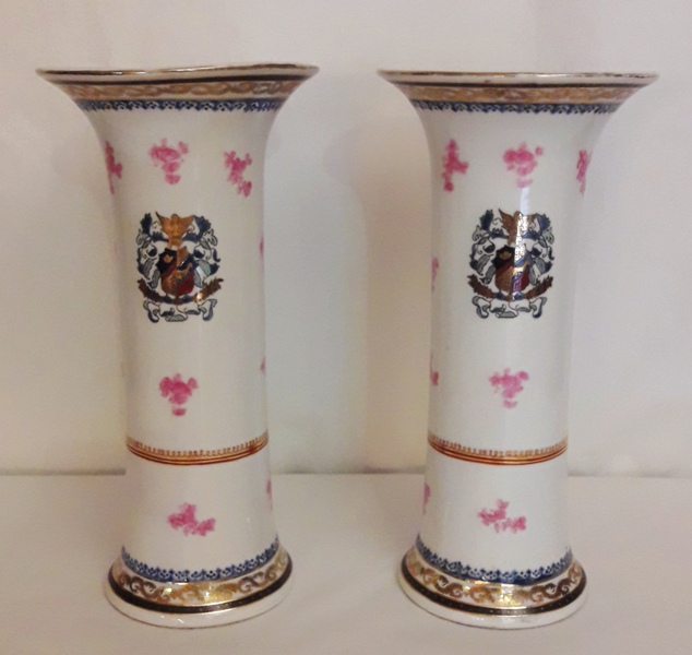 PORTAFIORI coppia realizzati in porcellana francese e arricchiti con decori floreali e stemmi. Dimensioni cm 15x31 H.