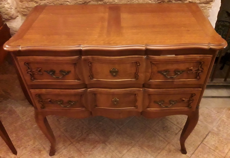 made of walnut, "Luigi XVI" style, early 1800s (1920s). It has 2 drawers, sabre feet and peelings on the front and sides. Cm size 92x46x79 H