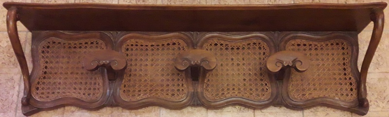 from the wall, suspended. Made of Vienna walnut and straw. It features 3 coat hangers and a top shelf for bags and hats. Cm size 110x22x30.