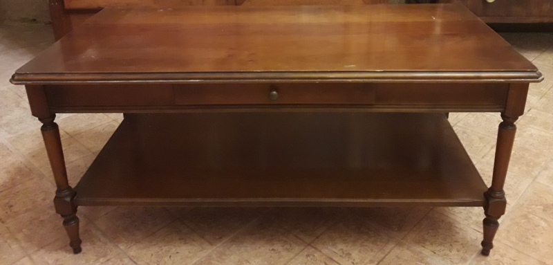 TAVOLINO da salone di forma rettangolare, realizzato in noce, degli anni 1950 / 60. Presenta un cassetto ed un ripiano interiore. Dimensioni cm 50x100x47H.