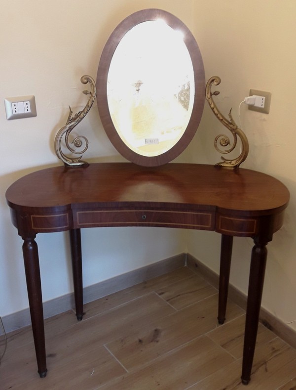 TOILETTA in ”stile Umbertino”, realizzata in radica. Presenta un cassetto frontale e specchio molato. Dimensioni cm 100x50x74, altezza totale con specchio cm 134.