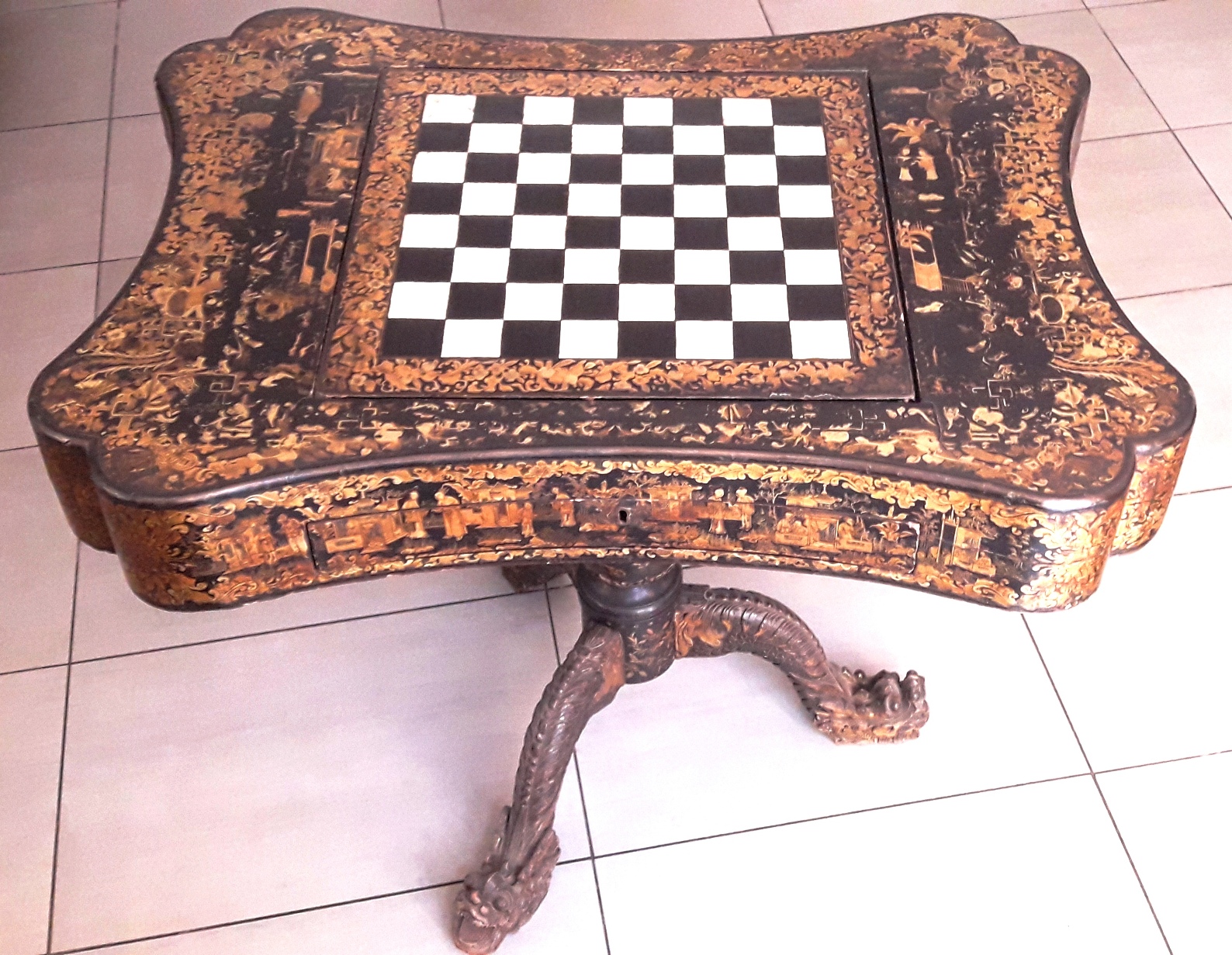 late 18th century, Chinese origin. Lacquered with gold decorations, drawer, opening top decorated on both fronts: one of the two bears chessboard with mother of pearl squares. Inside there is the backgammon board. The three feet finely carved with dragon heads and joined in a central painted leg. Dimensions 80x70x78 H.