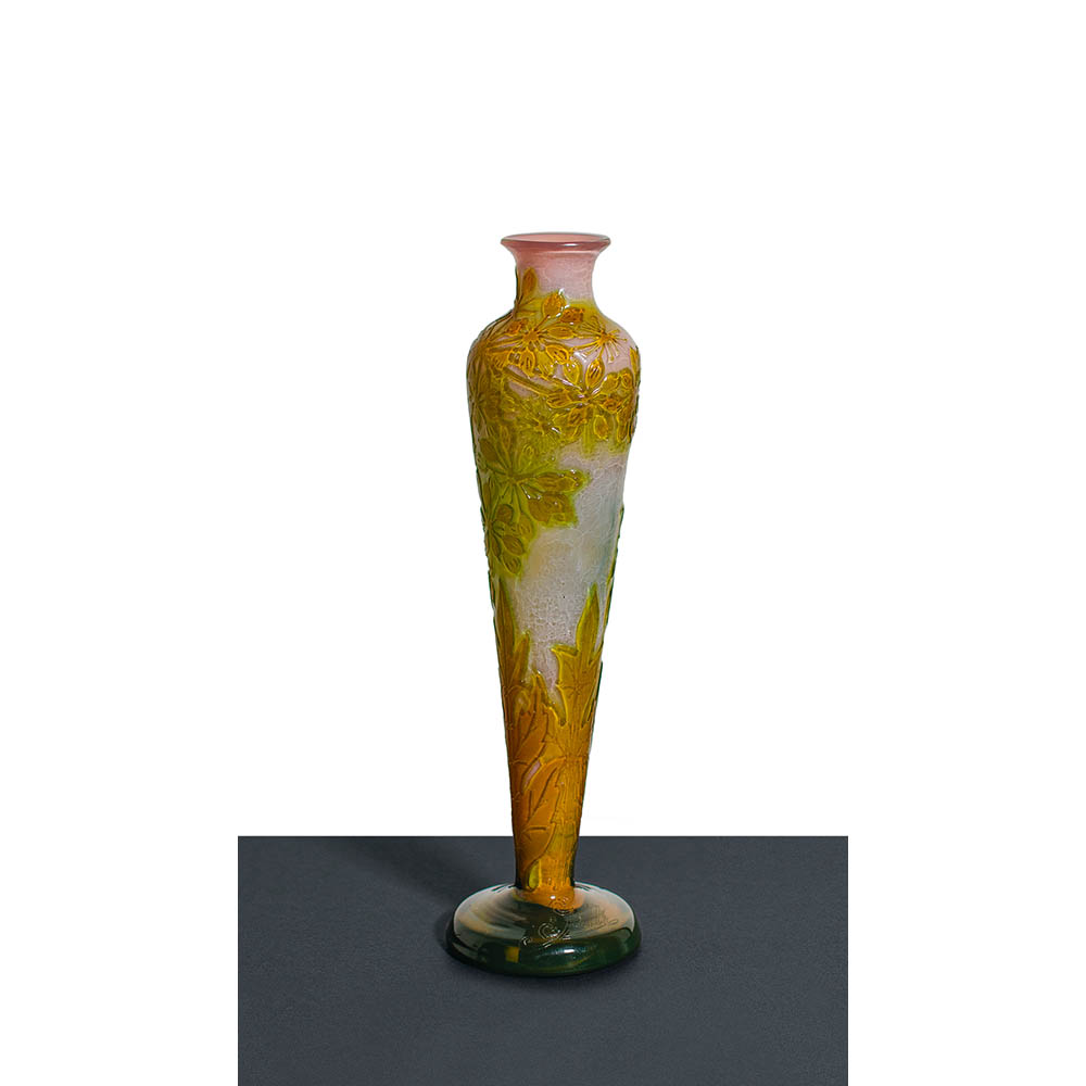 GALLE' - Vaso di forma conica con piede in vetro nei toni del giallo e del rosa lavorato a cammeo con ombrelle e lucidato a fuoco.