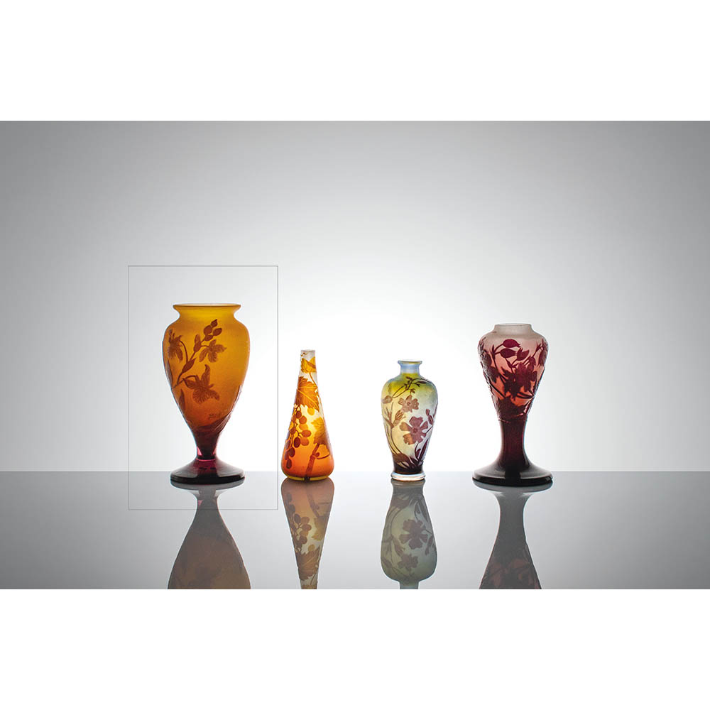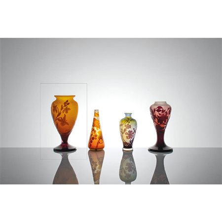 GALLE' - Vaso a balaustro in vetro nei toni dell’ocra con decorazione a cammeo nei toni del viola a guisa di foglie e fiori.