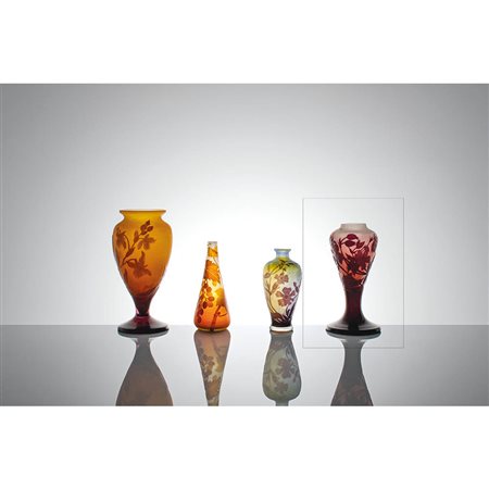 GALLE' - Vaso a balaustro in vetro nei toni dell’arancio con decorazione a cammeo nei toni del viola a guisa di foglie e fiori.