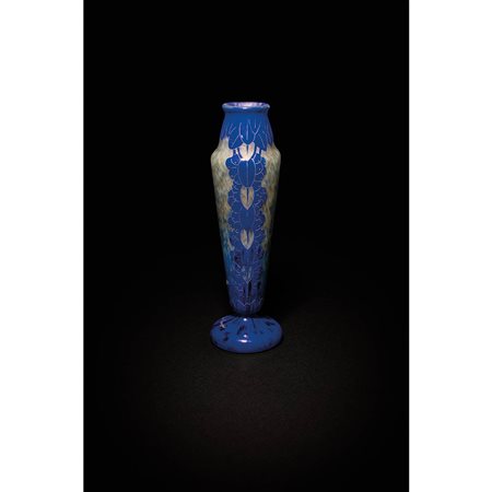 CHARLES SCHNEIDER, Le Verre Français - Vaso “Myrtilles” in vetro a più strati con decorazione a rilievo incisa all’acido a guisa di mirtilli nei toni del blu oltremare su fondo screziato a polveri policrome turchesi e azzurre, 1927 - 1928 circa.