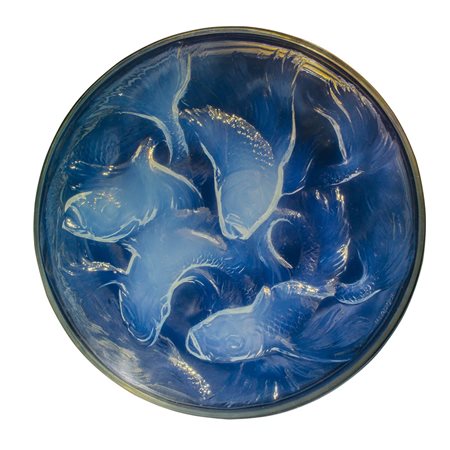 RENE' LALIQUE - Scatola “Cyprins” in vetro opalescente pressato a stampo e satinato con decorazione a guisa di pesci, modello n. 42 creato nel 1921 e non ripreso dopo il 1947; l’esemplare è databile prima del 1945, anno di morte di Renè Lalique, in quanto nella firma è ancora presente la lettera R.