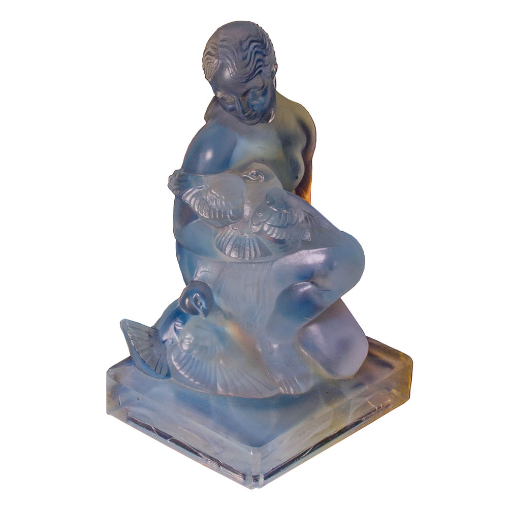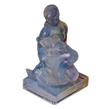 ERNST MARIUS SABINO - Statuetta in vetro opalescente pressato a stampo a guisa di giovane donna circondata da colombe.