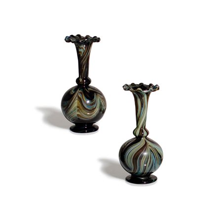 MURANO - Coppia di vasi a bulbo con orlo irregolare in vetro calcedonio, anni ‘20.