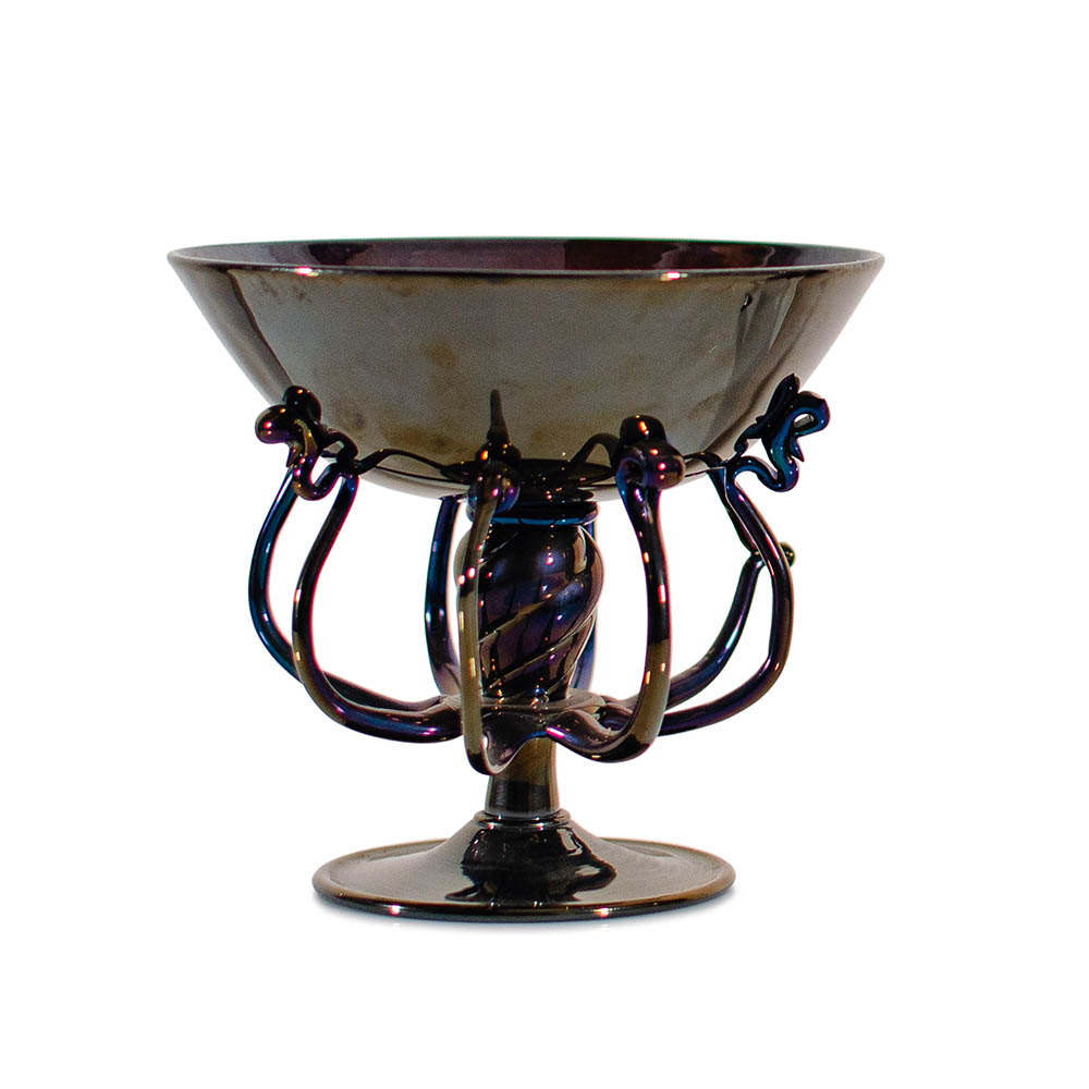 BENVENUTO BAROVIER, SALVIATI DOTT. ANTONIO (ATTR.) - Coppa in vetro scuro fortemente iridato con anse e piede applicato, probabilmente ascrivibile alla collezione di vasi “metalliformi” avviata da Salviati nel 1878, databile al 1900 circa.