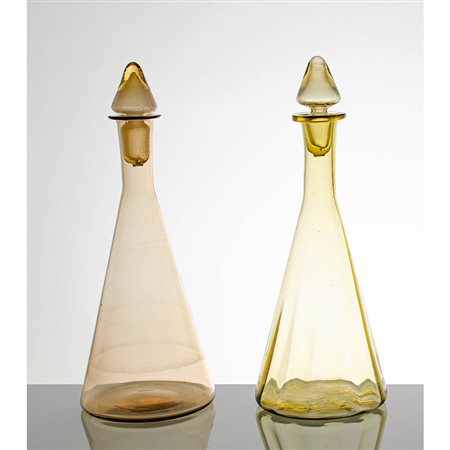 MURANO - Lotto composto da 2 bottiglie troncoconiche con tappo in vetro soffiato pagliesco, anni ‘30. altezze cm 32,5; cm 33.