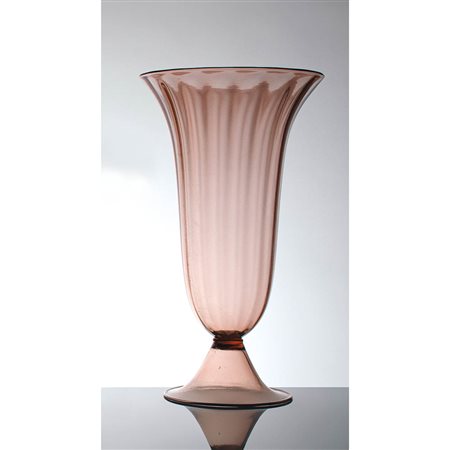 MURANO - Vaso in vetro soffiato a tromba nei toni del ciclamino con costolature ed alto piede, anni ‘30.