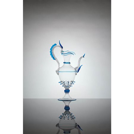 BAROVIER & TOSO Caraffa in vetro trasparente con decorazioni in vetro applicate nei toni dell’azzurro, anni ‘50.