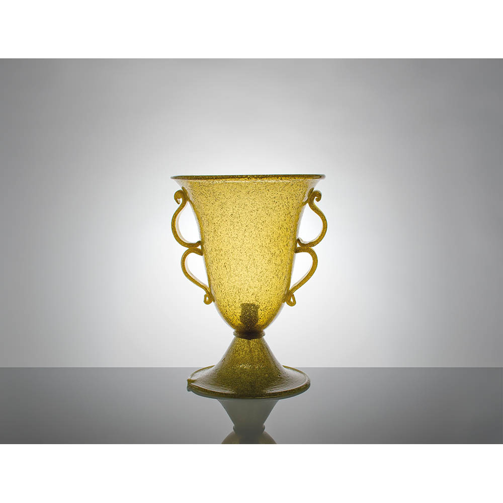 MURANO - Lampada da tavolo in vetro pulegoso nei toni del pagliesco con doppie anse applicate sui lati e grande piede sagomato con alloggio per il filo, anni ‘60.