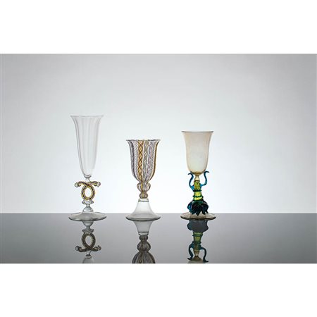 MURANO - Lotto composto da tre calici con decorazioni a filigrana o con elementi vitrei applicati a contrasto, anni ‘30.