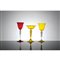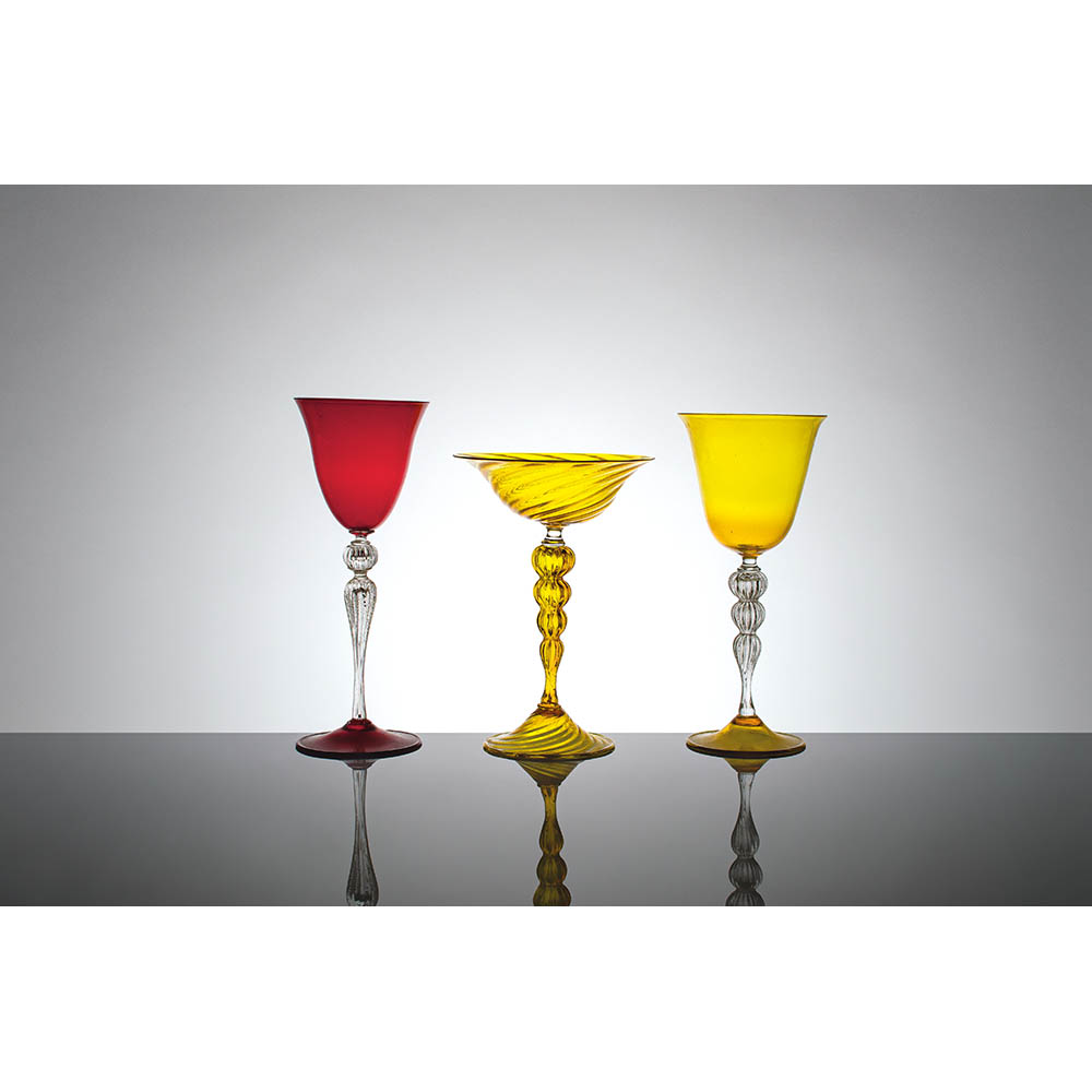 MURANO - Lotto composto da tre calici nei toni del rosso e del giallo con decorazione a foglia d’oro nel gambo, anni ‘30.