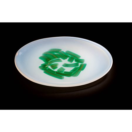 ANZOLO FUGA, A.V.E.M. - Piatto in vetro lattiginoso con inclusioni di vetro verde e foglia d’oro con superficie lievemente madreperlacea, anni ‘50.