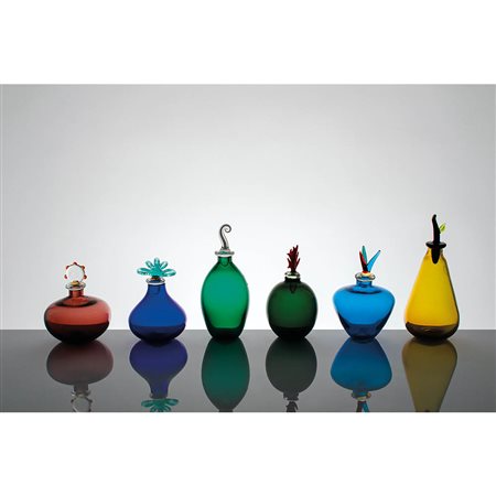 LAURA DIAZ DE SANTILLANA, VENINI - Serie di sei vasi monofiore in vetro policromo con tappi decorati, 1985 - 1988.