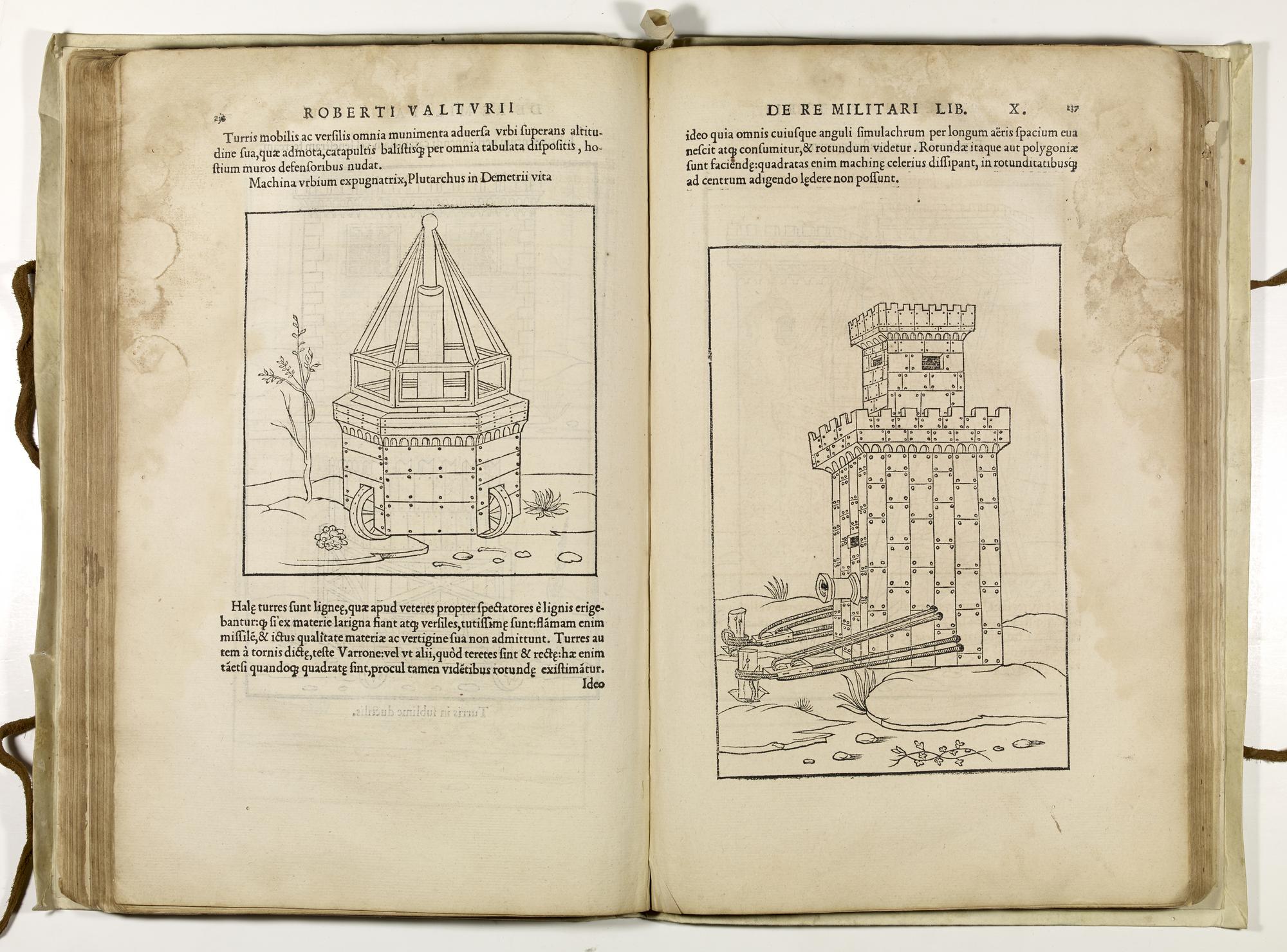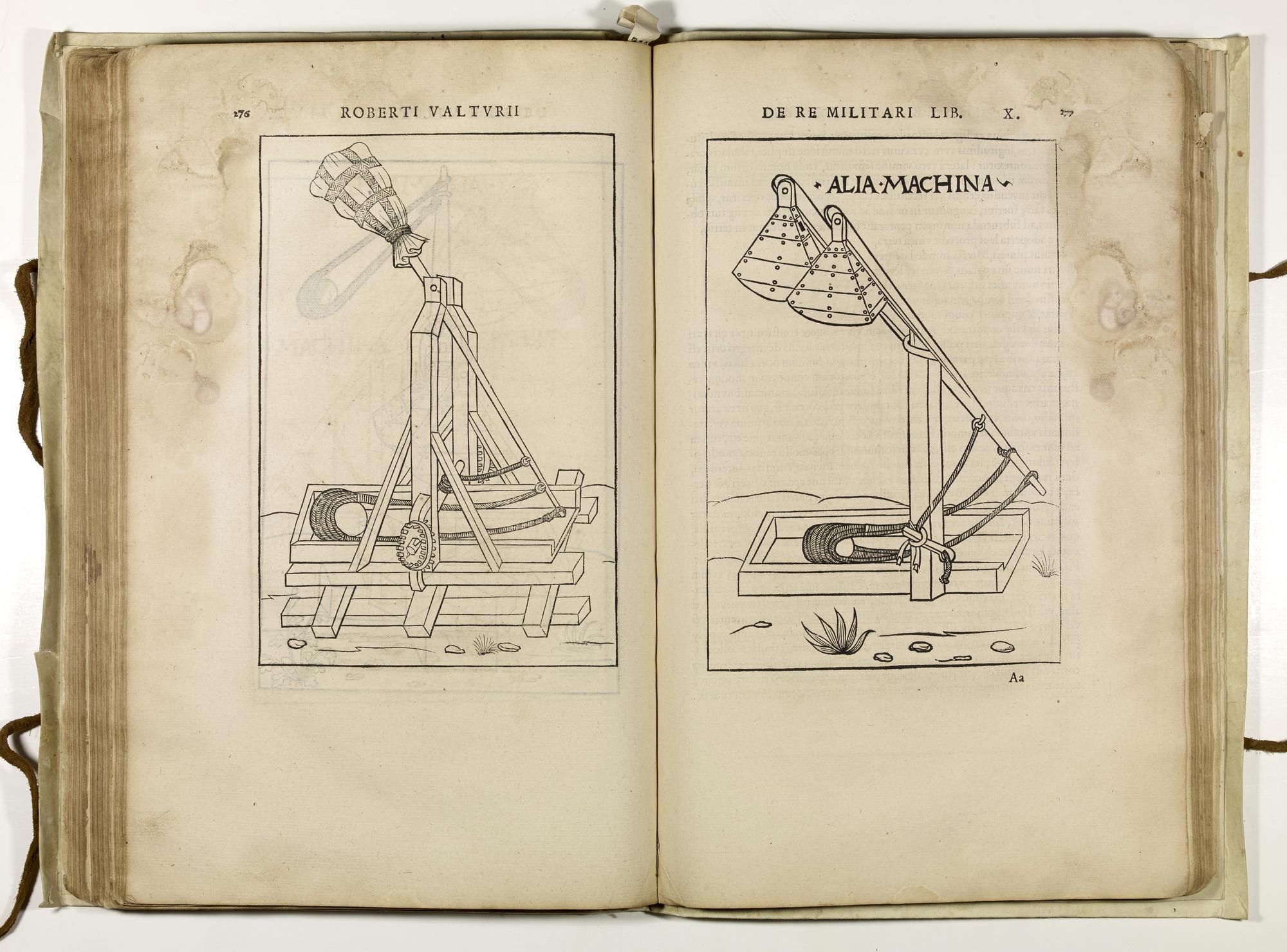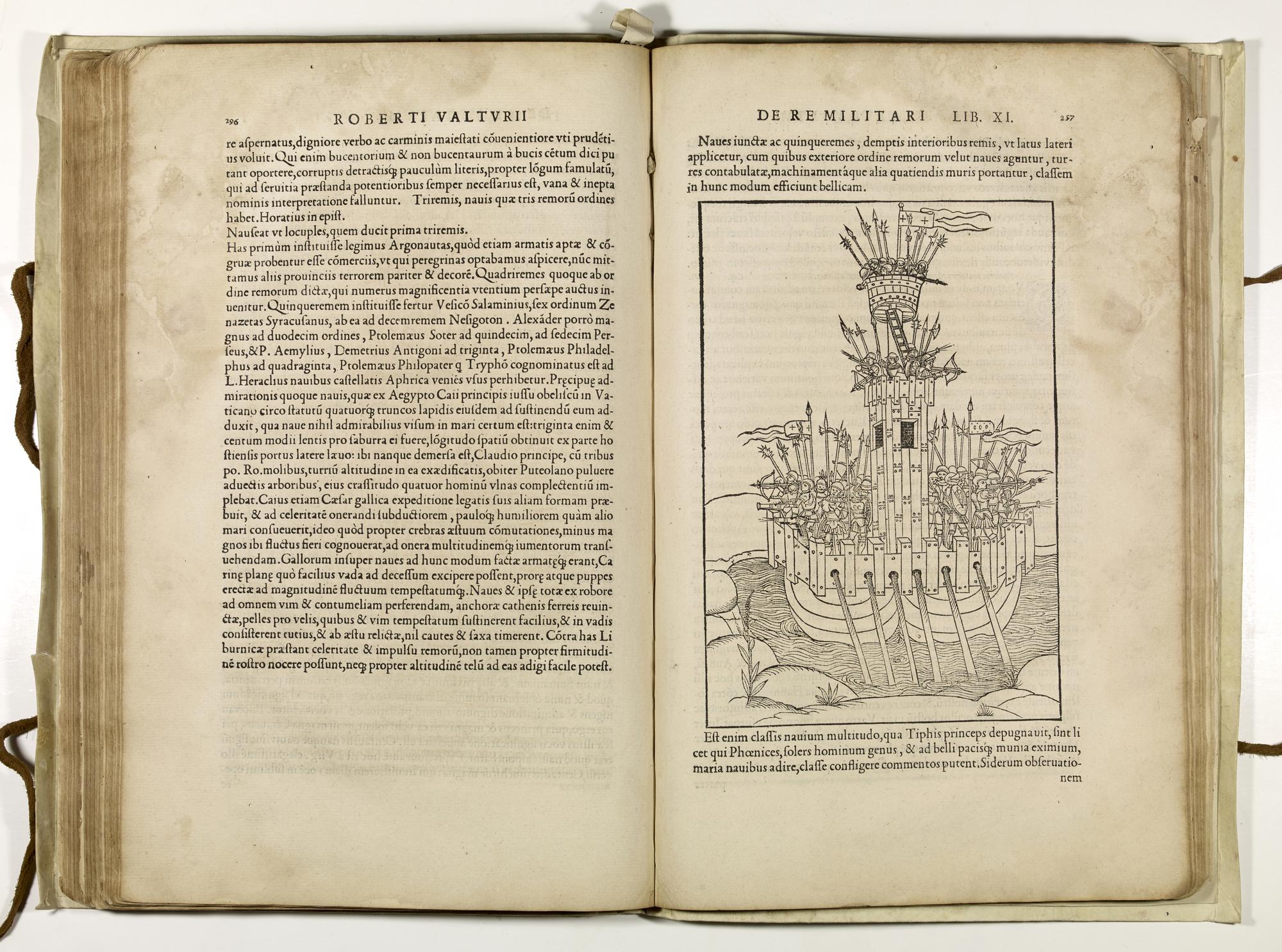 Le affascinanti illustrazioni "rappresentano le macchine da guerra usate dagli antichi, con modifiche medievali, e sono straordinariamente pittoresche e istruttive". Le magnifiche xilografie sono "copie in controparte" (Mortimer) dei blocchi usati per illustrare la seconda edizione (Verona, 1483) che furono a loro volta copiati dalla prima edizione (Verona: Johannes, 1472). Cockle nota che queste illustrazioni "si dice che provenissero dai disegni di Leonardo da Vinci". (Cockle p. 134). Il De Re Militari è essenzialmente un compendio delle ultime tecniche e dispositivi per scalare muri, catapultare missili, fortificare le fortificazioni. Il lavoro segna la transizione tra la guerra medievale e rinascimentale con l'applicazione di cannoni e polvere da sparo. Poco dopo la sua prima apparizione nel 1472, l'opera divenne un manuale principale per principi e capi militari del Rinascimento: Leonardo da Vinci ne fece uso mentre agiva come ingegnere capo di Cesare Borgia e anche prima della sua prima stampa il trattato era molto apprezzato e distribuito in manoscritto Il lavoro continuò a essere ristampato piω volte e le date suggeriscono che continuò ad avere un valore piω che antico: l'edizione del 1484 apparve poco dopo l'accensione del militante Carlo VIII e l'attuale edizione venne presa sulla scia dell'importante riorganizzazione di Francesco I Esercito francese. "L'importanza storica del De Re Militari sta nel fatto che è il primo libro stampato con illustrazioni di carattere tecnico o scientifico che raffigurano le idee di ingegneria progressiva del tempo dell'autore. Le xilografie illustrano l'equipaggiamento necessario per i militari e la marina ingegnere; comprendono torrette a pistola rotanti, piattaforme e scale per assedi, ruote a pale, tuta da sub, cintura di salvataggio, qualcosa che ricorda un carro armato, un pontone e altri ponti, una barca completamente chiusa che potrebbe essere sommersa per metà, ecc. (.) Il Valturius di Verona e le sue ristampe erano i manuali dei leader militari del Rinascimento, e Leonardo da Vinci, quando fungeva da ingegnere capo di Cesare Borgia, possedeva una copia e ne prese in prestito alcuni dei suoi disegni. "- Printing & the Mind of Man 10 - (1 ° ed. Del 1472). "La prima edizione stampata dell'opera di Valturio (1472) fu un capolavoro di tipografia e xilografia.