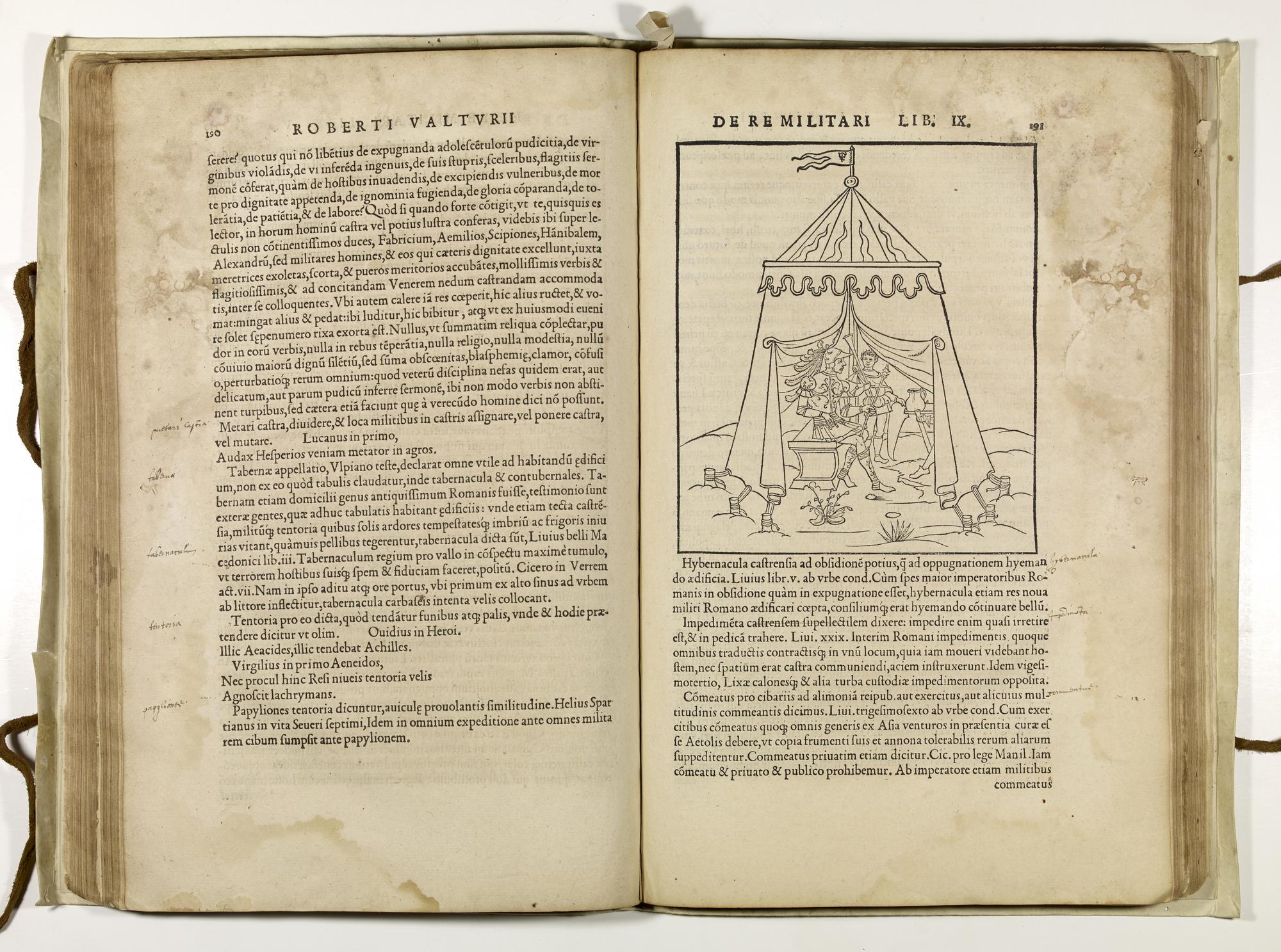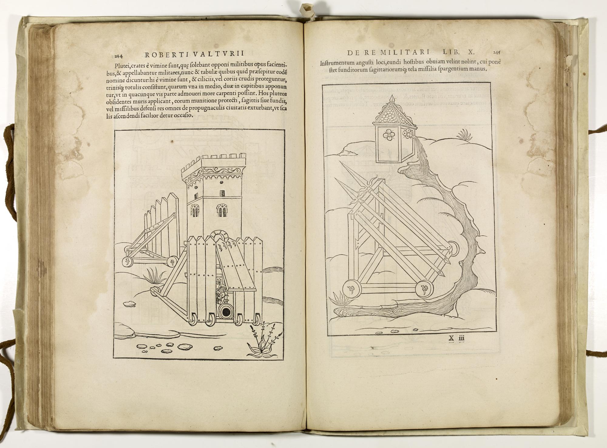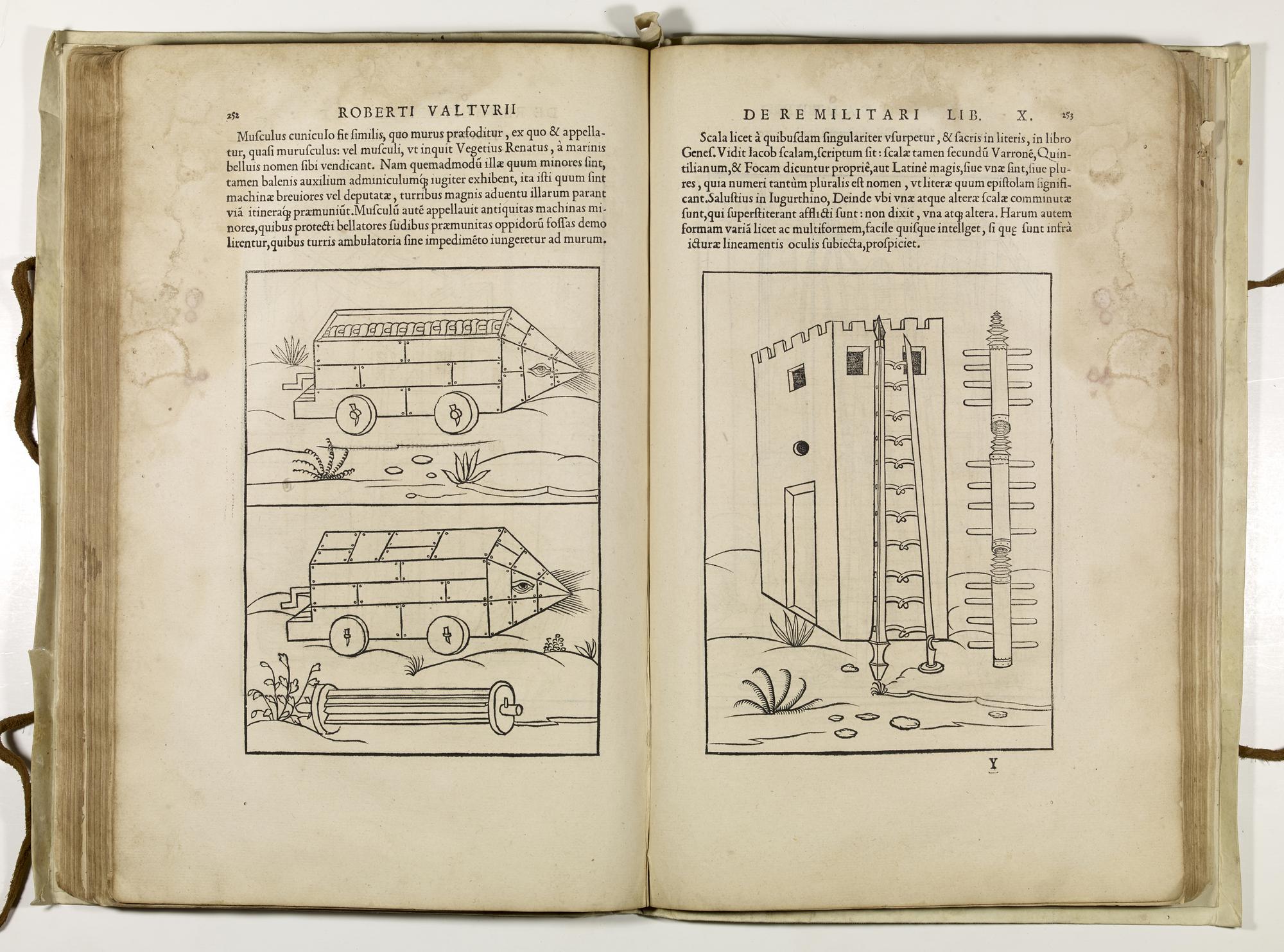Le affascinanti illustrazioni "rappresentano le macchine da guerra usate dagli antichi, con modifiche medievali, e sono straordinariamente pittoresche e istruttive". Le magnifiche xilografie sono "copie in controparte" (Mortimer) dei blocchi usati per illustrare la seconda edizione (Verona, 1483) che furono a loro volta copiati dalla prima edizione (Verona: Johannes, 1472). Cockle nota che queste illustrazioni "si dice che provenissero dai disegni di Leonardo da Vinci". (Cockle p. 134). Il De Re Militari è essenzialmente un compendio delle ultime tecniche e dispositivi per scalare muri, catapultare missili, fortificare le fortificazioni. Il lavoro segna la transizione tra la guerra medievale e rinascimentale con l'applicazione di cannoni e polvere da sparo. Poco dopo la sua prima apparizione nel 1472, l'opera divenne un manuale principale per principi e capi militari del Rinascimento: Leonardo da Vinci ne fece uso mentre agiva come ingegnere capo di Cesare Borgia e anche prima della sua prima stampa il trattato era molto apprezzato e distribuito in manoscritto Il lavoro continuò a essere ristampato piω volte e le date suggeriscono che continuò ad avere un valore piω che antico: l'edizione del 1484 apparve poco dopo l'accensione del militante Carlo VIII e l'attuale edizione venne presa sulla scia dell'importante riorganizzazione di Francesco I Esercito francese. "L'importanza storica del De Re Militari sta nel fatto che è il primo libro stampato con illustrazioni di carattere tecnico o scientifico che raffigurano le idee di ingegneria progressiva del tempo dell'autore. Le xilografie illustrano l'equipaggiamento necessario per i militari e la marina ingegnere; comprendono torrette a pistola rotanti, piattaforme e scale per assedi, ruote a pale, tuta da sub, cintura di salvataggio, qualcosa che ricorda un carro armato, un pontone e altri ponti, una barca completamente chiusa che potrebbe essere sommersa per metà, ecc. (.) Il Valturius di Verona e le sue ristampe erano i manuali dei leader militari del Rinascimento, e Leonardo da Vinci, quando fungeva da ingegnere capo di Cesare Borgia, possedeva una copia e ne prese in prestito alcuni dei suoi disegni. "- Printing & the Mind of Man 10 - (1 ° ed. Del 1472). "La prima edizione stampata dell'opera di Valturio (1472) fu un capolavoro di tipografia e xilografia.