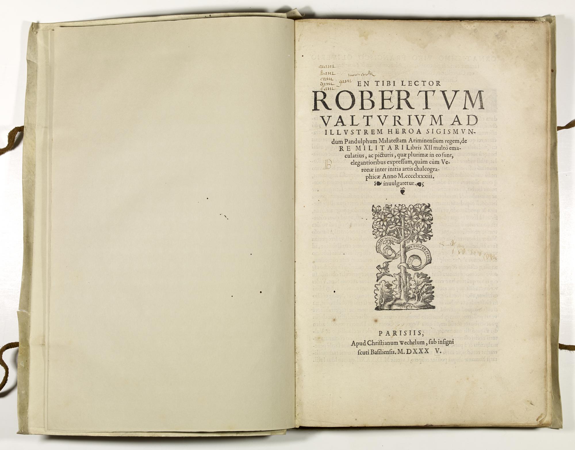 En tibi lector Robertum Valturium Ad Illustrem Heroa Sigismundum Pandulphum Malatestam (...) DE RE MILITARI Libri XII (...). Parisiis; Apud Christianum Wechelum, sub insigni scuti Basiliensis 1535 (settembre 1534)