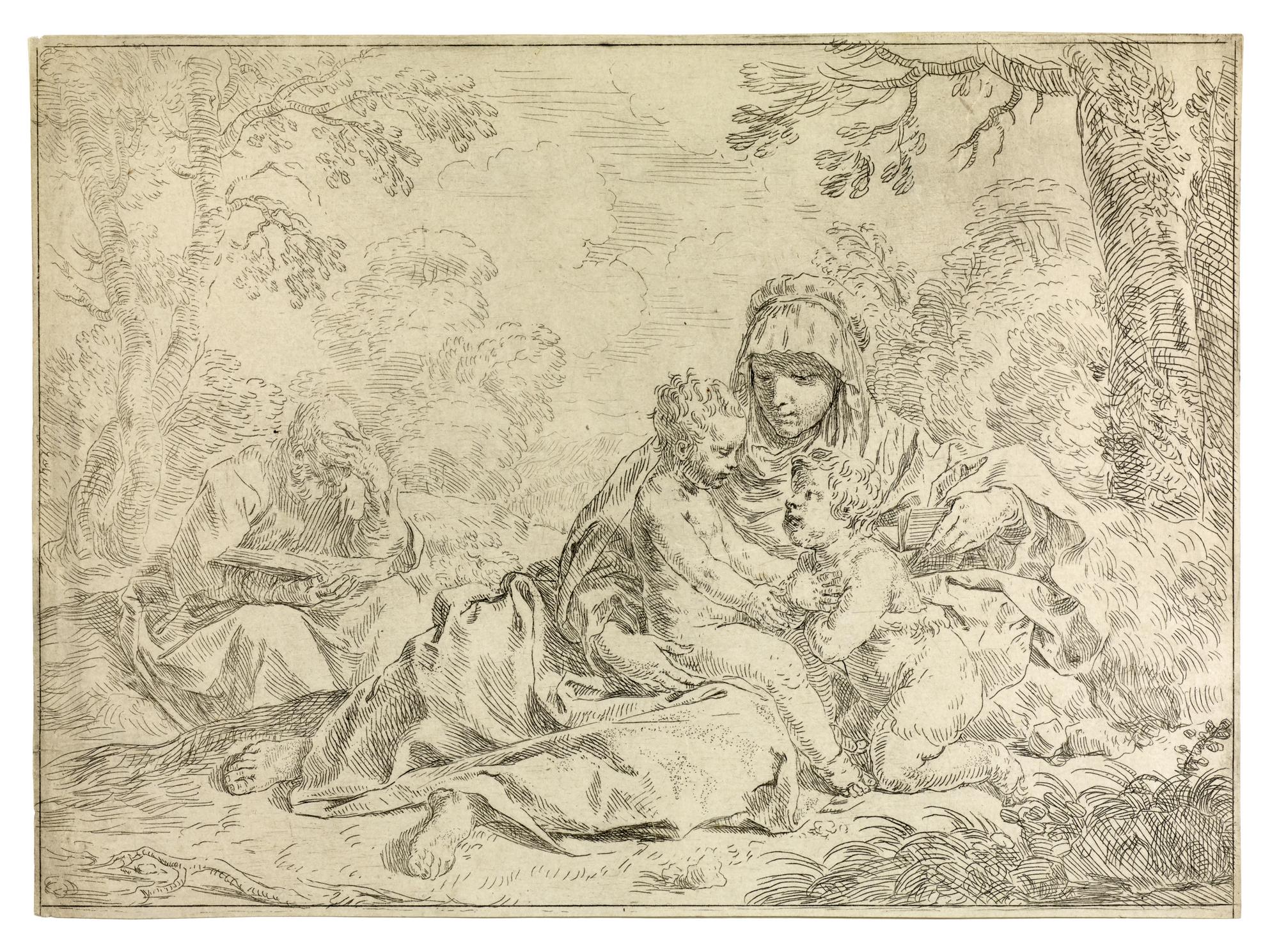 Simone Cantarini (1612 - 1648) SACRA FAMIGLIA CON SAN GIOVANNINO acquaforte,...