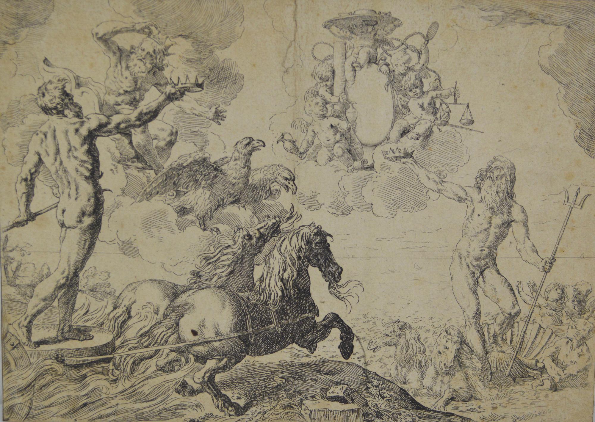 Bartsch, 29; Bellini 1980, 35. Incisione dedicata a Pietro Maria Borghese morto a Roma nel 1642 e per lungo tempo assegnata a Guido Reni. Bellissima prova brillantemente inchiostrata, nel IV stato su 4, dopo l'abrasione dello stemma in basso a destra e dei simboli nello stemma Borghese. L'incisione, a volte impropriamente intitolata Quos Ego? (dal verso dell'Eneide, I, 145) è un omaggio al cardinale Pietro Maria Borghese, morto a Roma nel 1642. Il soggetto raffigura Giove (in alto a sinistra) su un carro trainato da due aquile, Plutone (in primo piano a sinistra) su un carro trainato da cavalli e che esce dalle fiamme e infine Nettuno (a destra), nell'atto di togliersi le loro corone per offrirle in omaggio alle armi del cardinal Borghese che si vedono (vedevano) al centro in alto sostenute da Putti, quattro dei quali recano i simboli iconografici delle virtω cardinali: la colonna (fortezza), la bilancia (giustizia), due vasi (temperanza), lo specchio e il serpente (prudenza). Piω sopra un quinto putto reca il cappello cardinalizio.