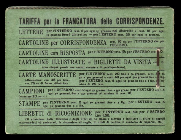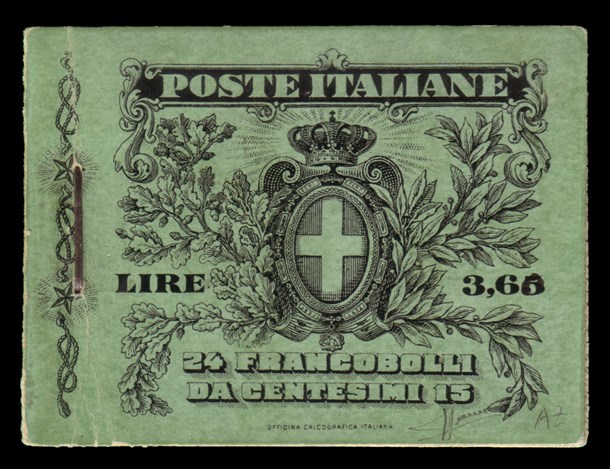 Libretto contenente 4 blocchi da 6 esemplari del 15c. grigio nero (Sass. 80), posto in vendita inizialmente a 3,65 lire e nel 1909 ridotto a 3,60 lire
