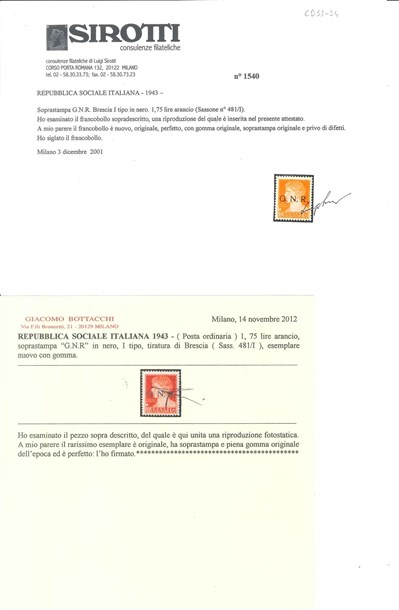 R.S.I. 1943 Tiratura di Brescia 1,75 lire arancio "Imperiale" con soprastampa "