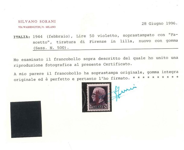 Lot 370 | R.S.I. 1944 Tiratura di Firenze 50 lire "Fascetto", soprastampa lilla Provenie