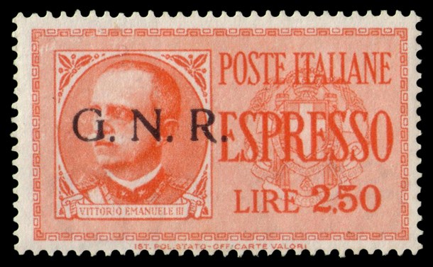 Espressi. 2,50 lire arancio con soprastampa "G.N.R." del I tipo sull'effigie